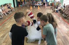 Также Нептун провел подвижные игры «Море волнуется», где дети изображали красивые морские фигуры; «Принеси царю водицы», где дети в ведерках носили царю воду; игра «Нептун и ладошки», где дети должны были успеть спрятать свои ладошки, чтобы Нептун не дотронулся трезубцем; игра «Ловись рыбка».
