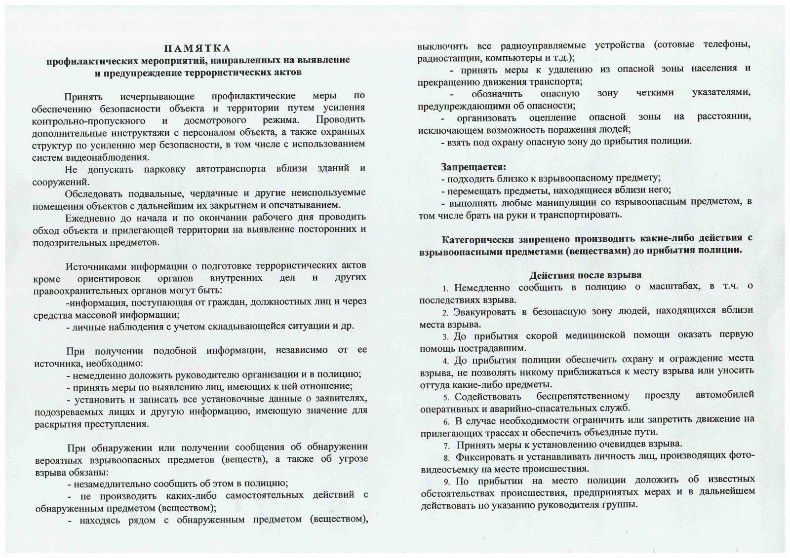 Памятка профилактических мероприятий, направленных на выявление и предупреждения террористических актов