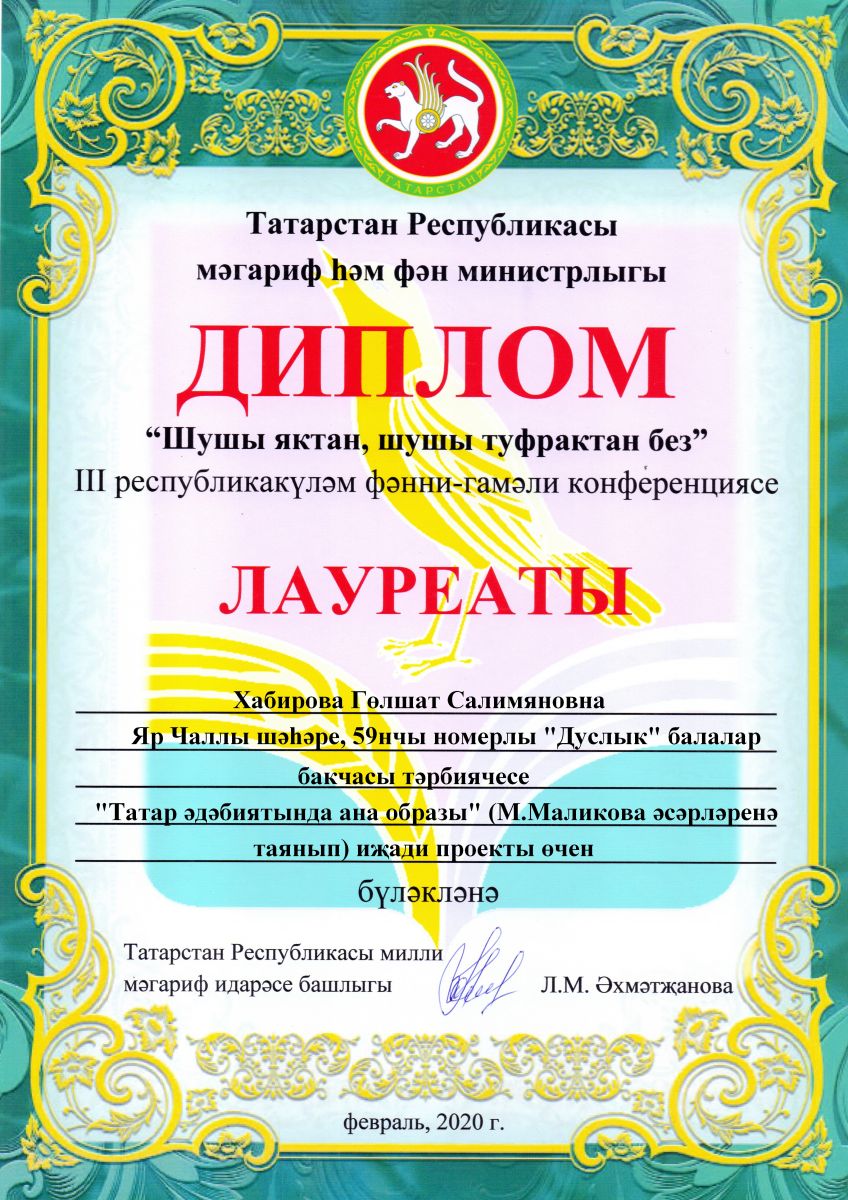 1. фәнни гамәли конференция "Шушы җирдән, шушы туфрактан без" Хабирова Г.С. диплом лауреата