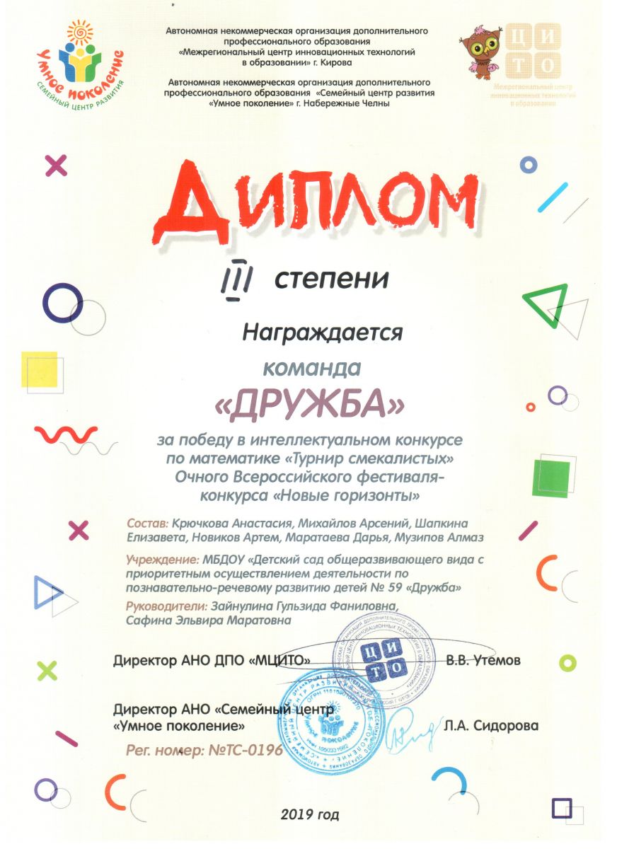 1. Интеллектуальный конкурс "Турнир смекалистых" (диплом 3 степени)