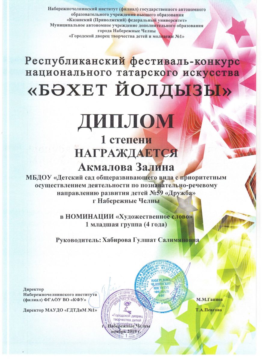 1.Фестиваль конкурс национального татарского искуства "Бәхет йолдызы" Акмалова Залина диплом 1 степени