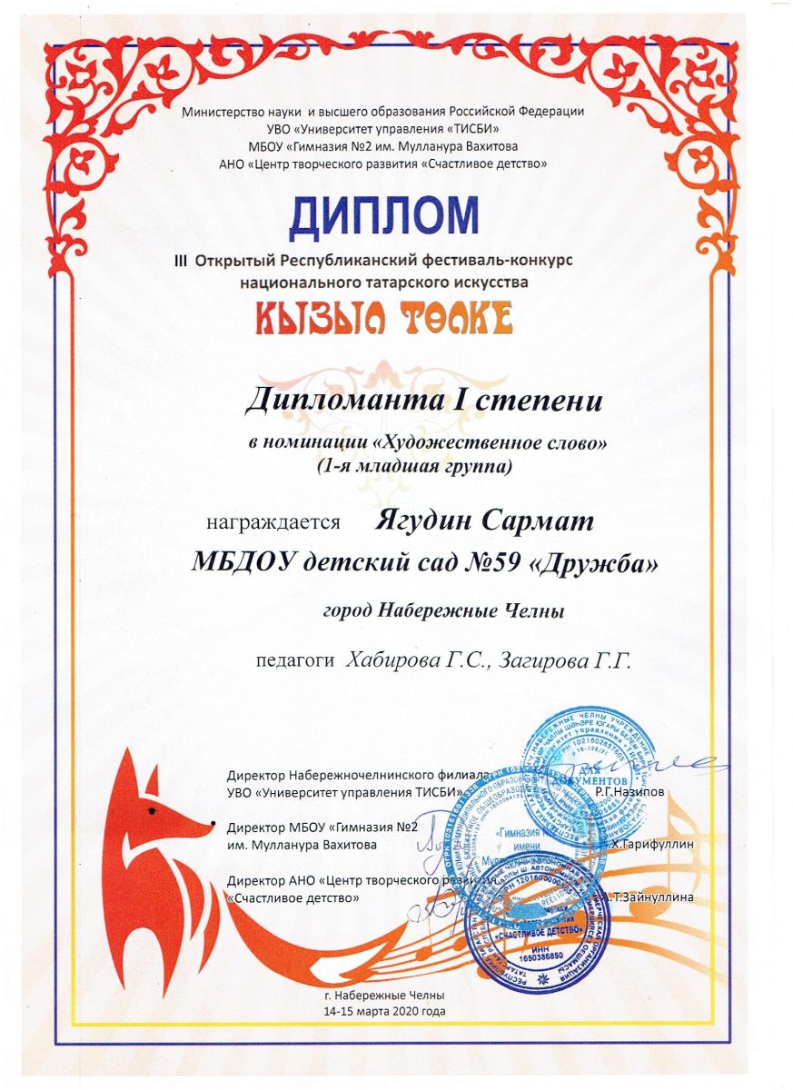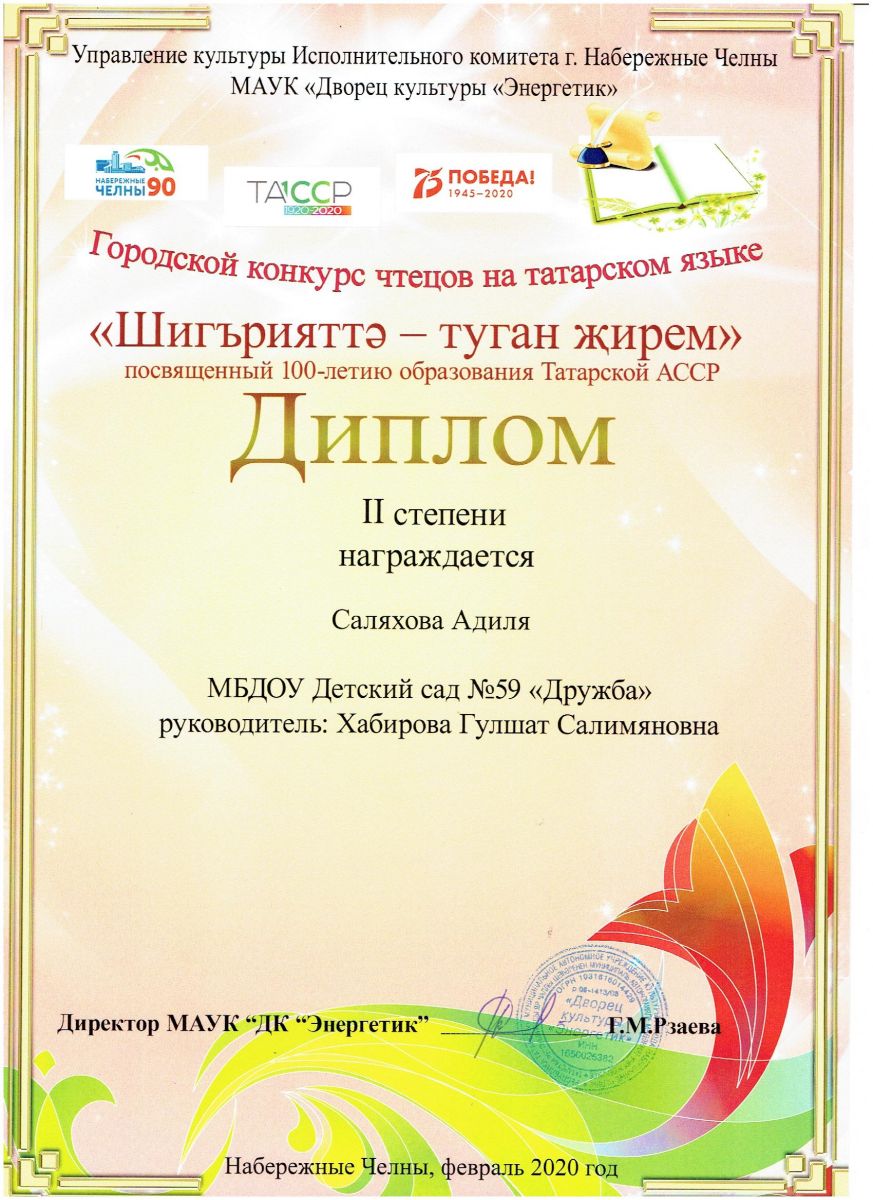2. "Шигърияттә - туган җирем" Ягудин Сармат диплом лауреата 3 степени, Саляхова Адиля диплом 2 степени