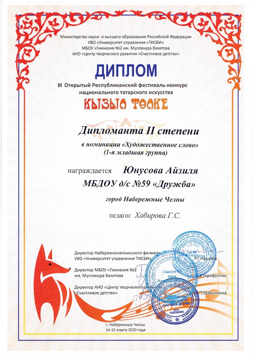 2. Фестиваль конкурс национального татарского искуства "Кызыл төлке" Акмалова Залина диплом лауреата 1 степени, Юнусова Айзиля диплом 2 степени, Ягудин Сармат диплом 1 степени