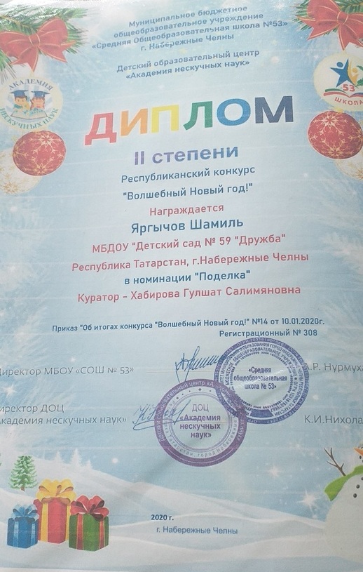 2. Конкурс рисунков и поделок "Новогоднее чудо" Гайнатуллин Раиль диплом