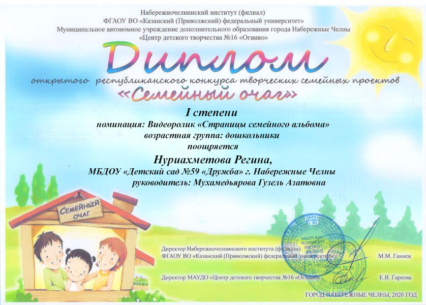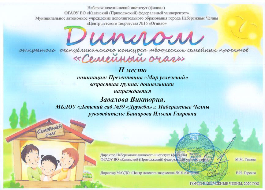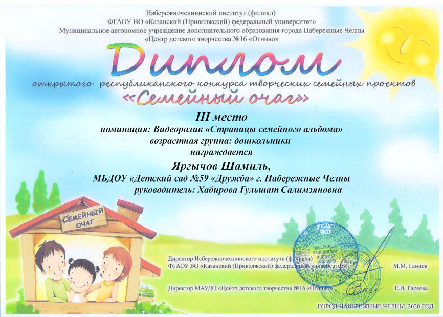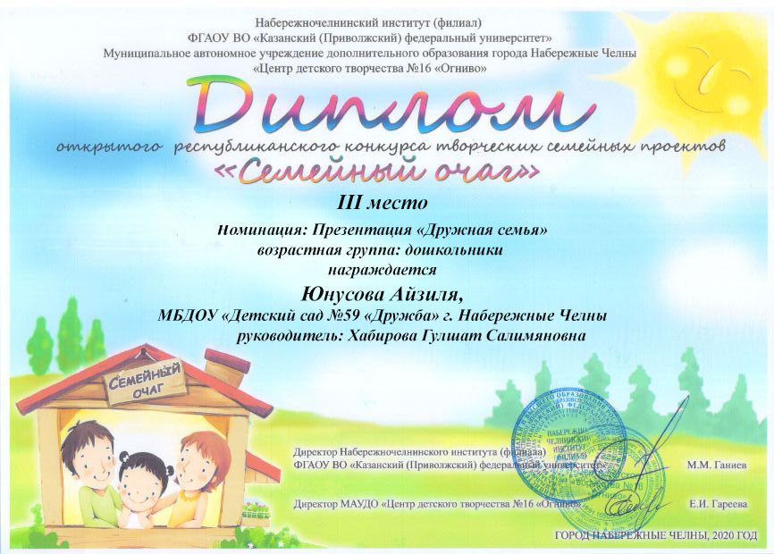 3. конкурс творческих семейных проектов "Семейный очаг" Юнусова Айзиля диплом 3 место, Яргычов Шамил диплом 3 место, Замалатдинова Анастасия диплом 1 место, Завалова Виктория диплом 2 место, Нуриахметова Регина диплом 1 место