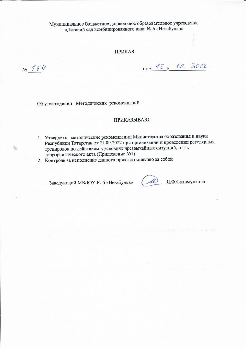 Приказ № 164 от 12.10.2022 г. "Об утверждении Методических рекомендаций"