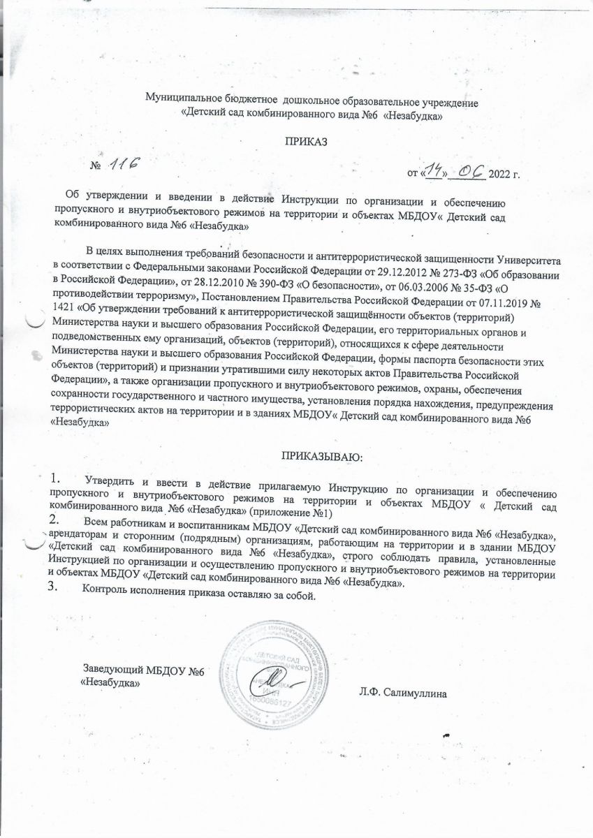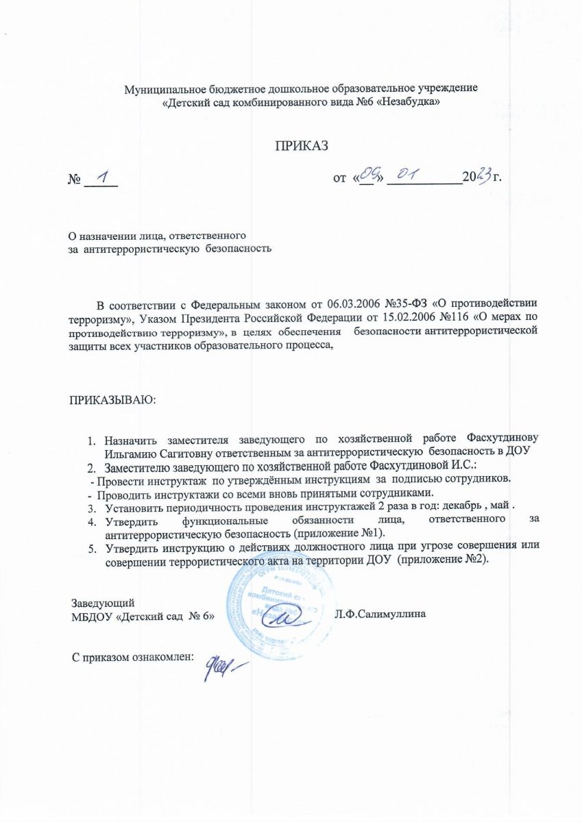 Приказ № 1 от 09.01.2023 г. "О назначении лица ответственного за антитеррористическую безопасность"