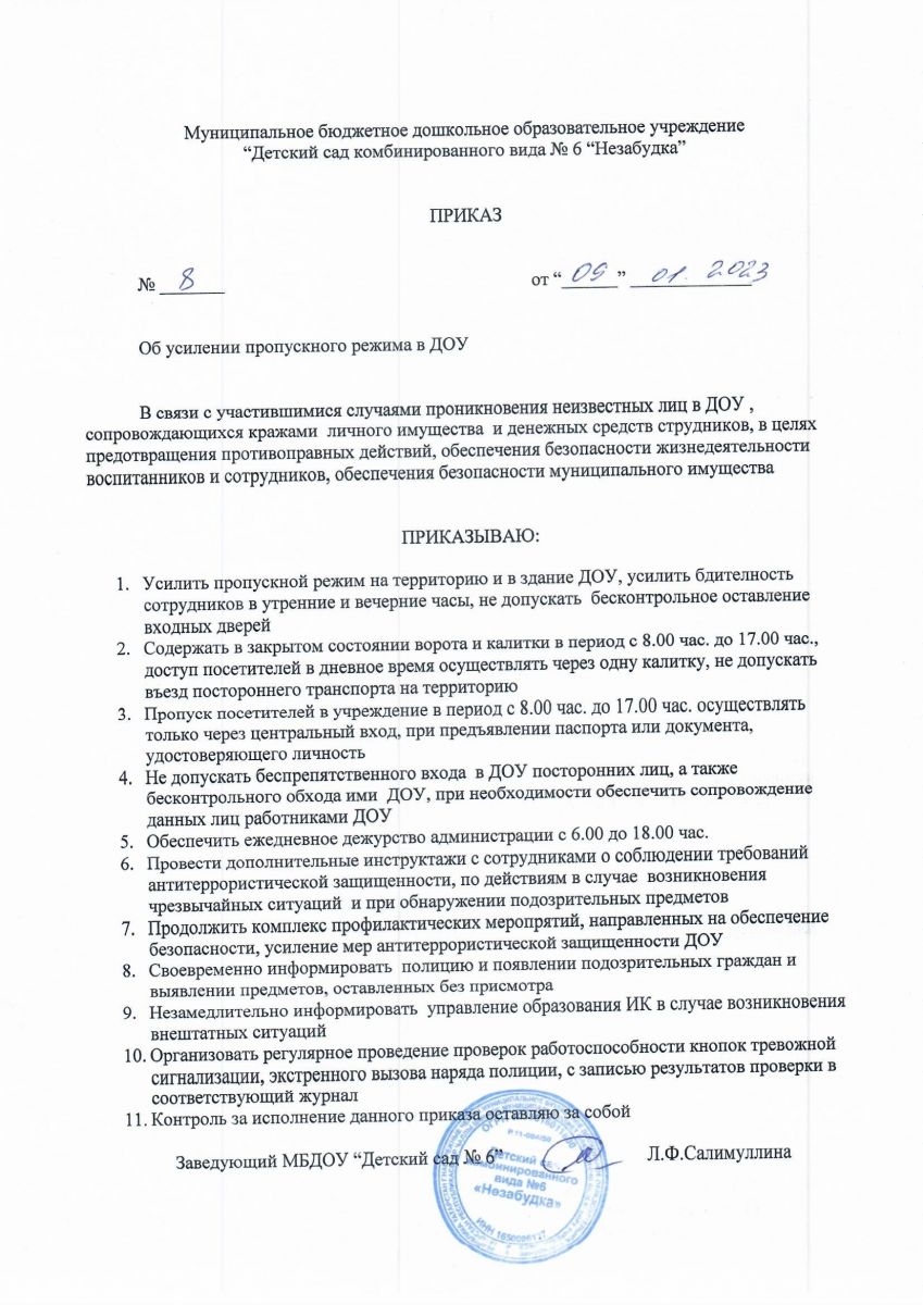Приказ № 8 от 09.01.2023 г. "Об усилении пропускного режима"