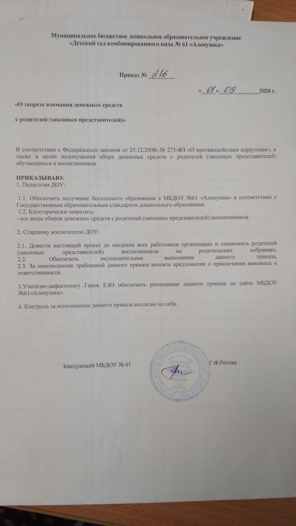 Уважаемые педагоги и родители (законные представители) воспитанников ДОУ. Предлагаем ознакомиться с Приказом о запрете взимания денежных средств с родителей (законных представителей)"