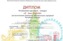 Вопитанница нашего детского сада Майя стала победительницей регионального фестиваля-конкурса «I love English!» для воспитанников дошкольных образовательных учреждений Республики Татарстан. Поздравляем нашу победительницу и благодарим педагогов и родителей за подготовку к конкурсу!