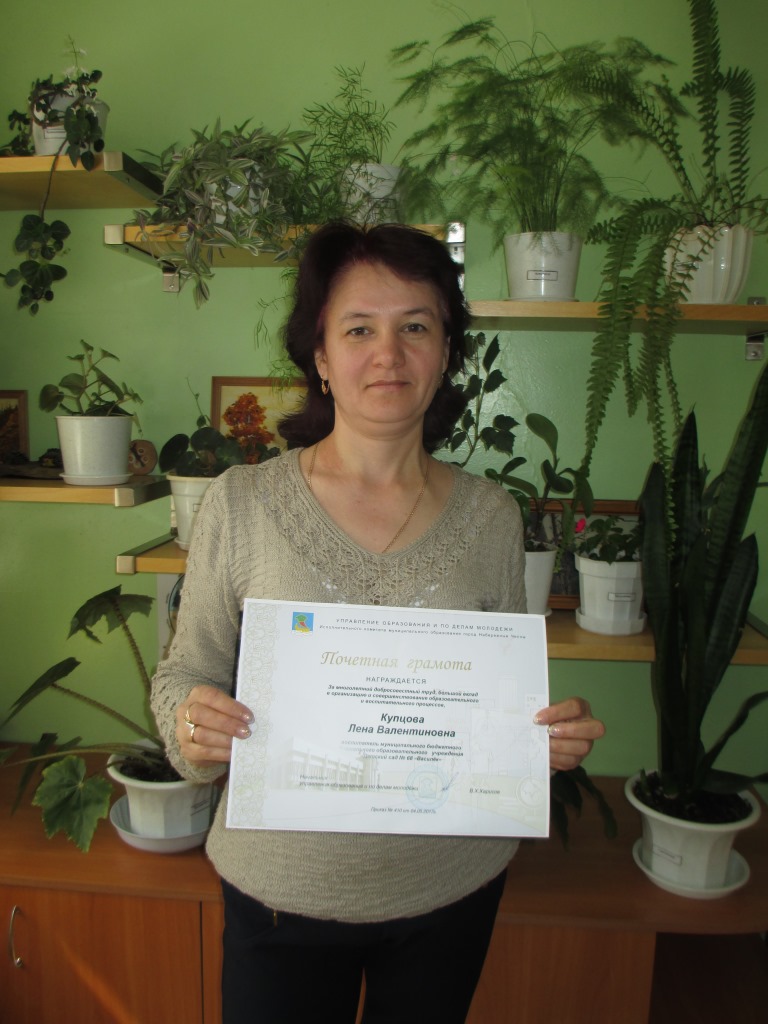 Опубликовано: 30.05.2017Почетной грамотой Управления образования и по делам молодежи Исполнительного комитета муниципального образования г. Набережные Челны за многолетний добросовестный труд, большой вклад в организацию и совершенствование образовательного и воспитательного процессов НАГРАЖДЕНА Купцова Лена Валентиновна - воспитатель 4 группы.