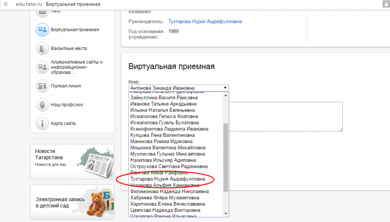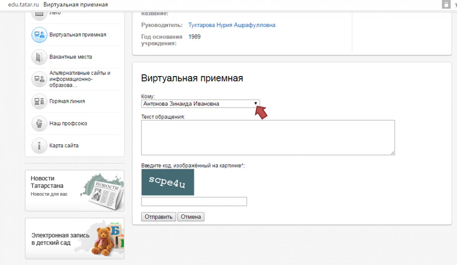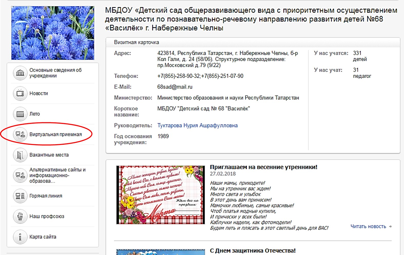 С вопросами и предложениями вы можете обратиться кзаведующей ДОУ – Туктаровой Нурие АшрафулловнеПредлагаем несколько вариантов:1. Лично подойти на прием в ДОУ. График работы - ежедневно, прием по личным вопросам – вторник, до 18.00.2. Обратиться через электронную почту 68sad@mail.ru3. Или через официальный сайт, оставив свой комментарий в разделе «Виртуальная приемная» ФОТО1 ФОТО2 ФОТО34. По телефону +7(855)-258-90-32 -