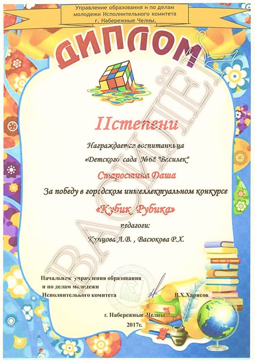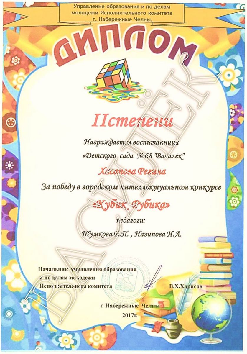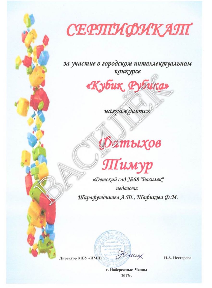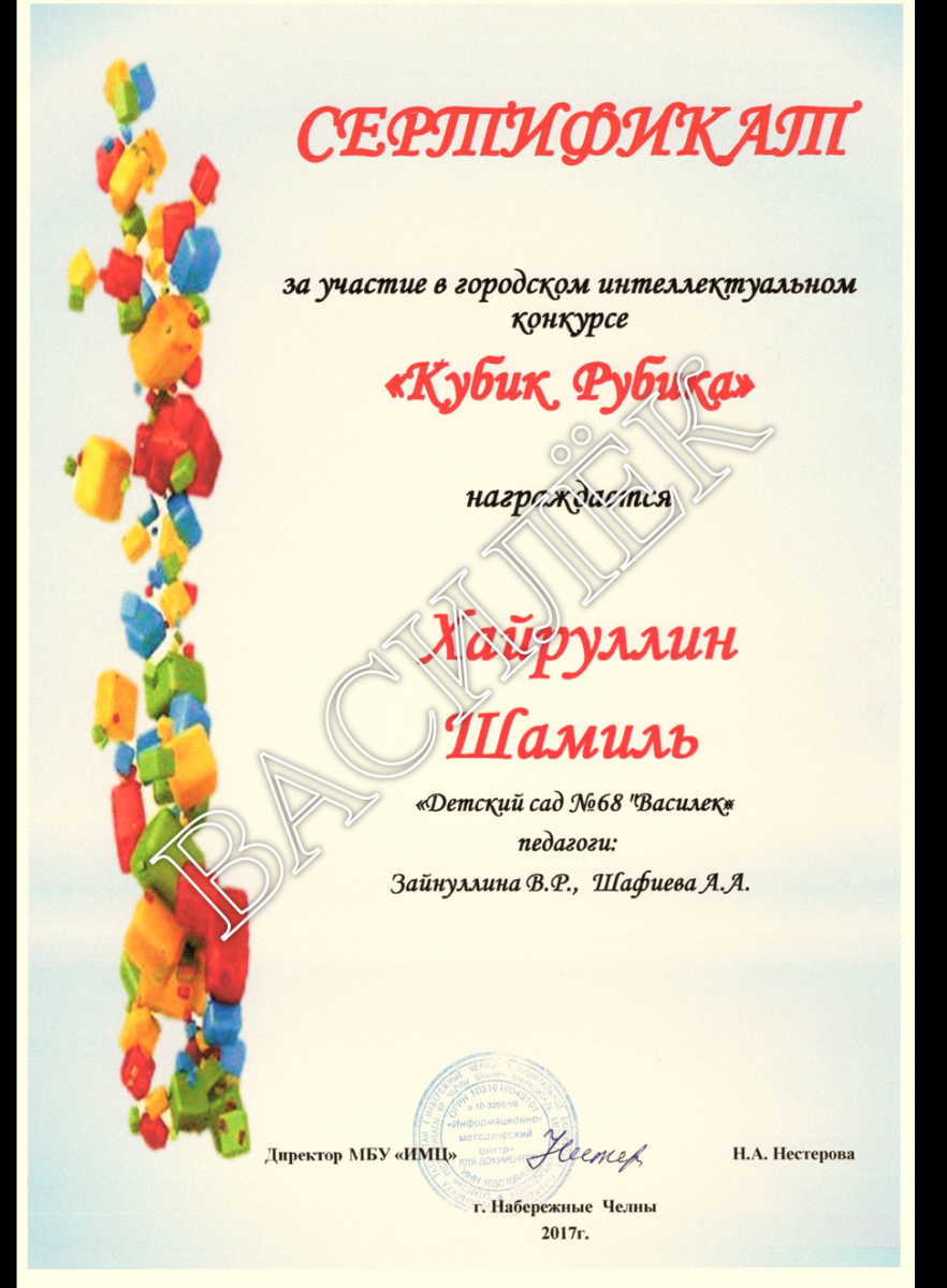 Старостина Даша, Хаснова Регина диплом II степени, Хайруллин Шамиль, Фатыхов Тимур, сертификат участника в городском интелектуальном конкурсе "Кубик Рубика", 2017