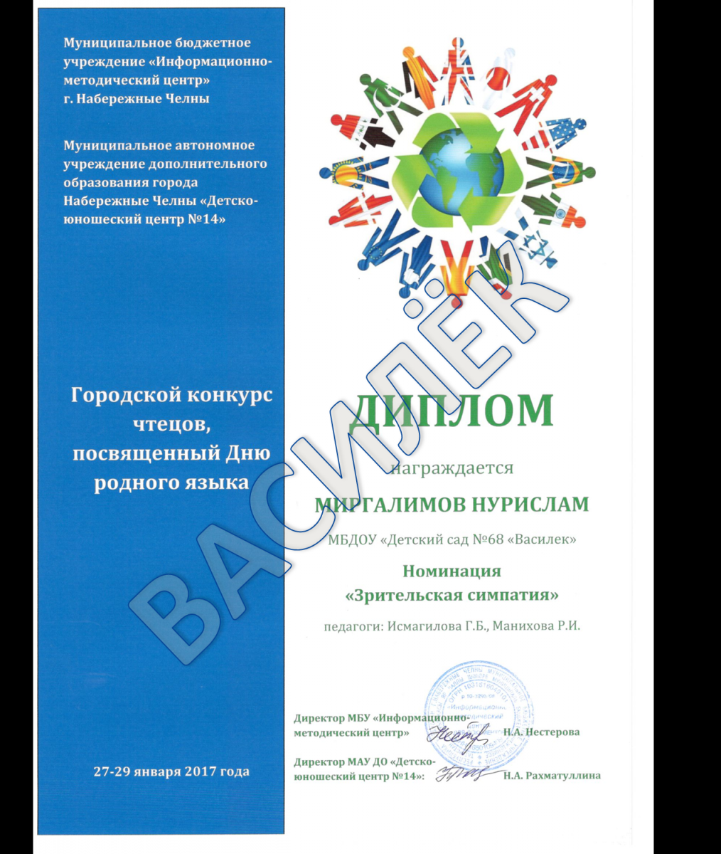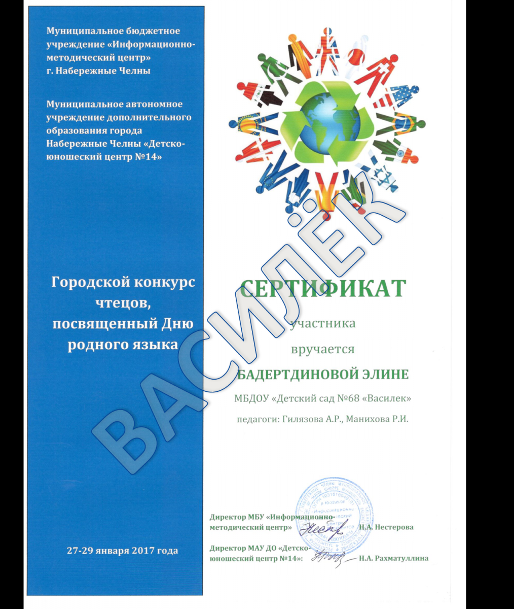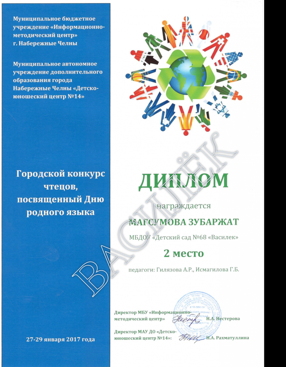 Магсумова Зубаржат, диплом II место, Миргалимов Нурислам, диплом, Бадертдинова Элина, сертификат участника, Городской конкурс чтецов, посвященный Дню родного языка, 2017