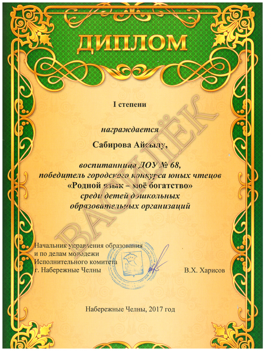 Сабирова Айсылу, диплом I степени в городском конкурсе юных чтецов "Родной язык - моё богатство", 2017