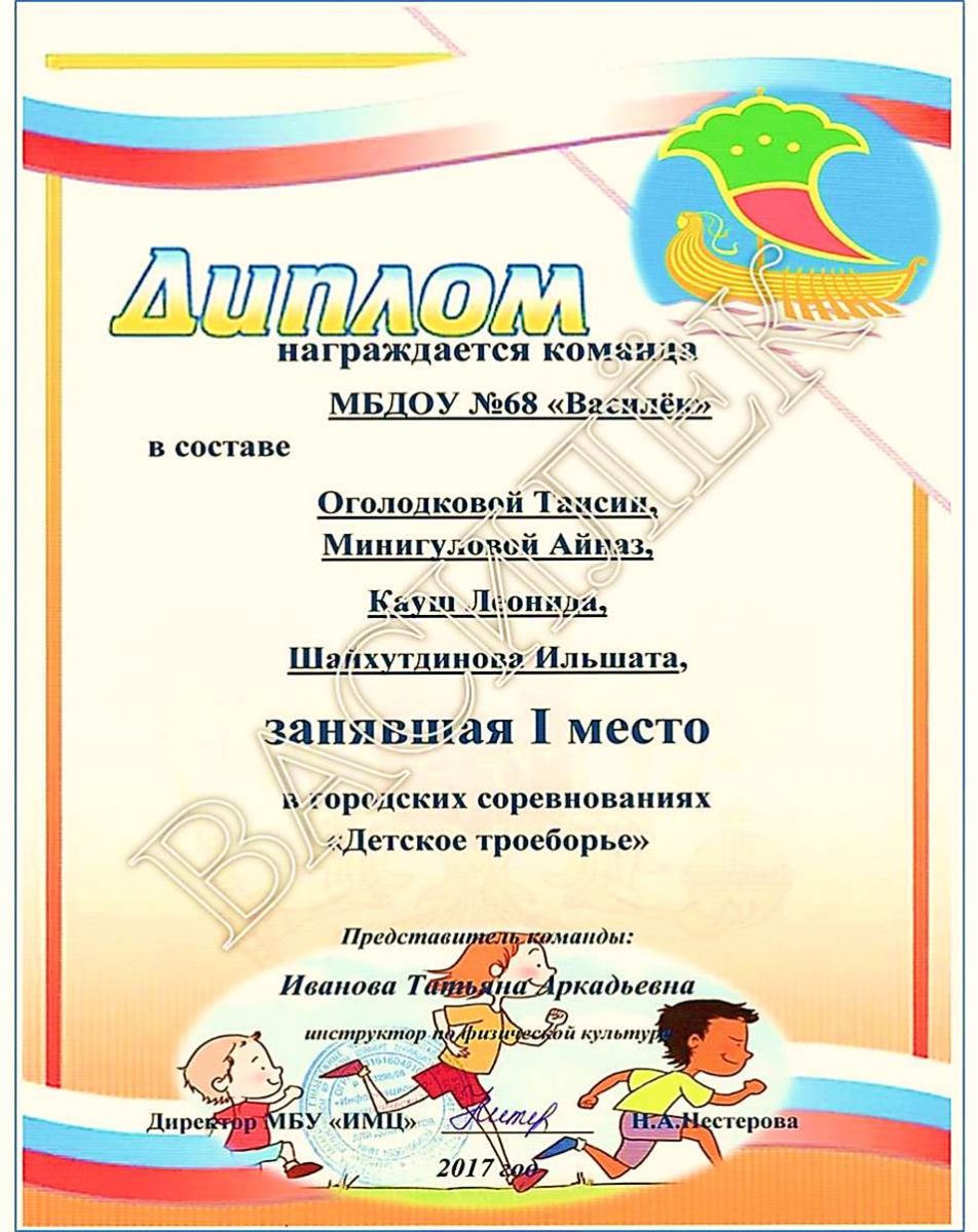 Команда МБДОУ №68 "Василёк", диплом I место в городских соревнованиях "Детское троеборье", 2017