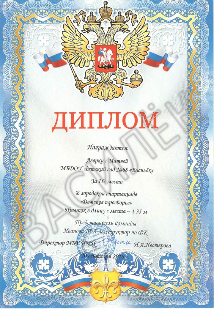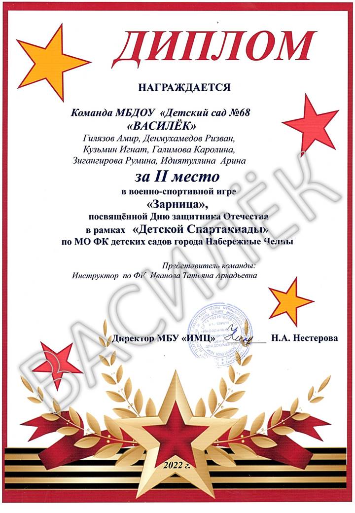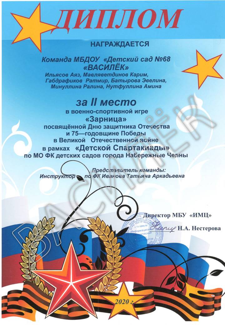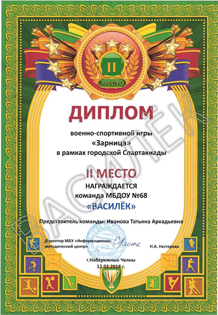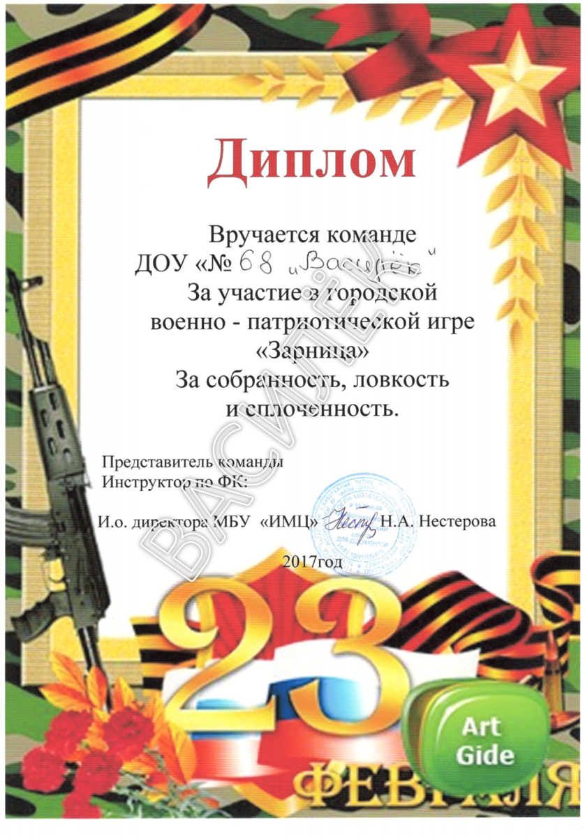 МБДОУ №68 «Василёк», диплом за участие в городской военно-патриотической игре "Зарница", 2017