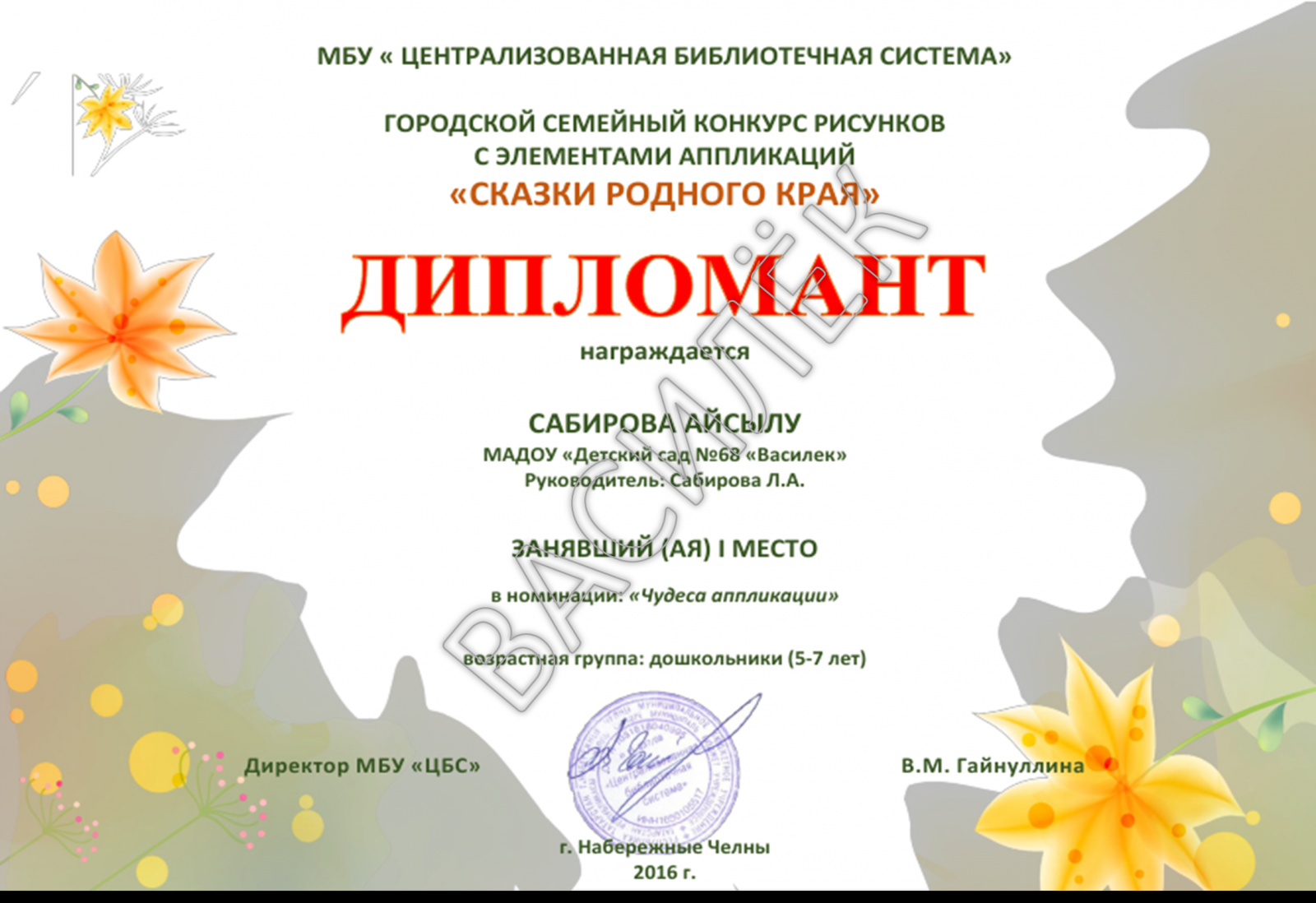 Сабирова Айсылу, дипломант, I место в городском семейном конкурсе рисунков с элементами аппликаций "Сказки родного края" в номинации "Чудеса аппликации", 2016