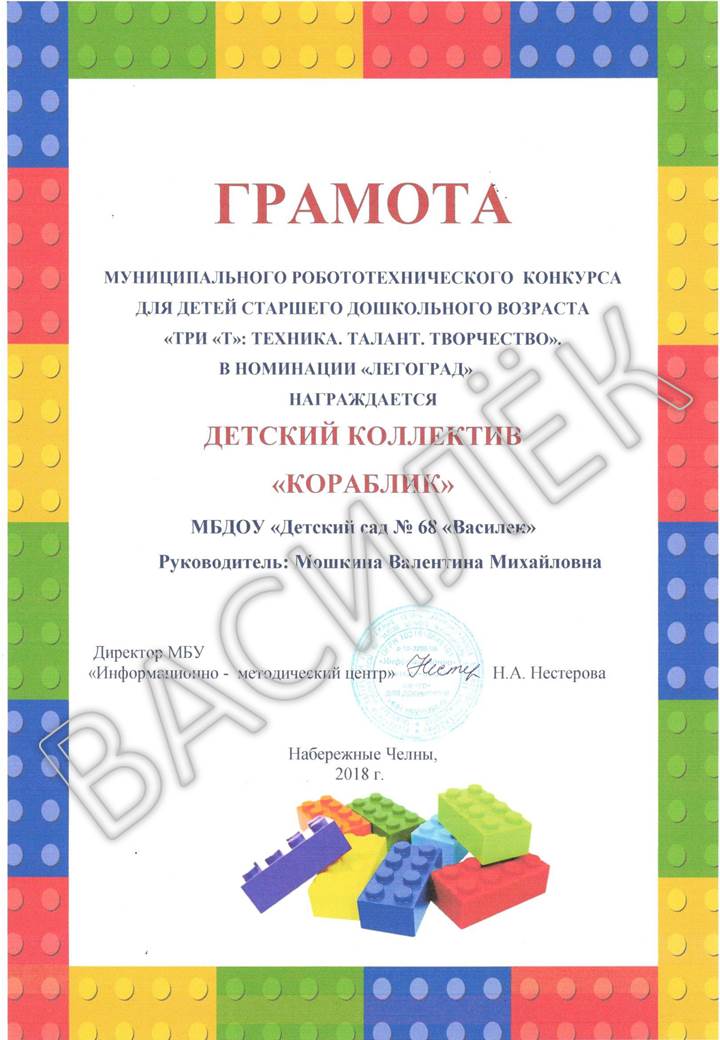 Детский коллектив "Кораблик", грамота, Харламов Александр, сертификат за участие, Нырков Кирилл, сертификат за участие роботехнического конкурса "Три "Т": Техника, Талант, Твочество", в номинации "легоград", 2018