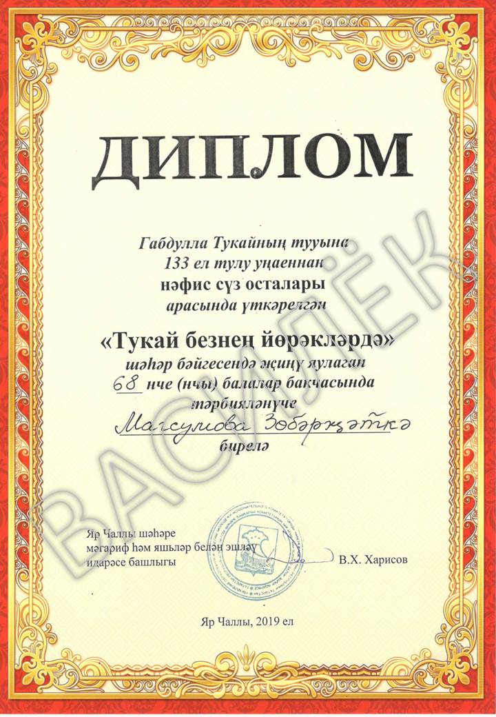 Магсумова Зубаржат, диплом городского конкурса юных чтецов "Тукай безнең йөрәкләрдә", приуроченный к 133-летию со дня рождения великого татарского поэта Габдуллы Тукая, 2019