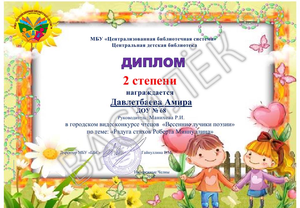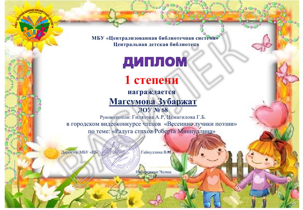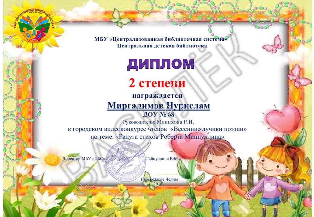 Магсумова Зубаржат диплом 1 степени, Миргалимов Нурислам диплом 2 степени, Давлетбаева Амира диплом 2 степени, видео конкурс чтецов «Весенние лучики поэзии» по теме «Радуга стихов Роберта Миннуллина», 2018