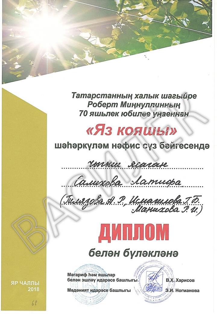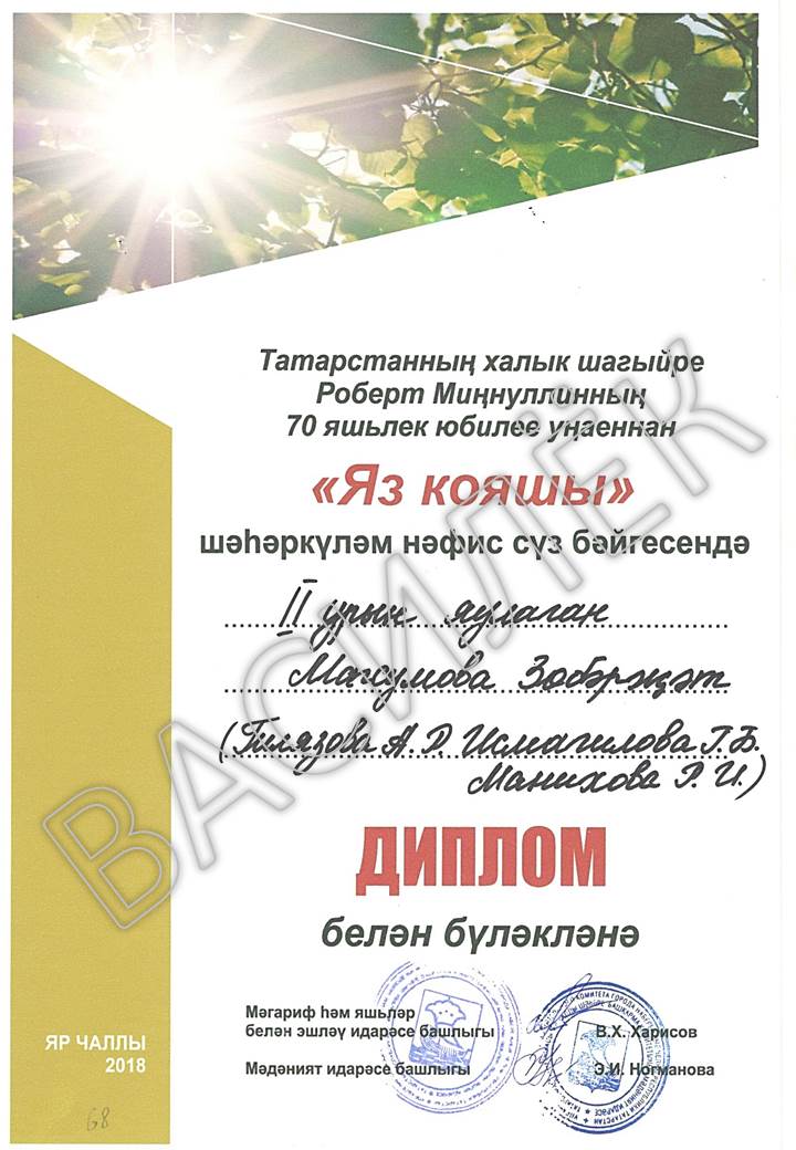 Магсумова Зубаржат диплом 2 степени, Миргалимов Нурислам диплом 3 степени, Давлетбаева Амира диплом участника, Салихова Латифа диплом участника городского конкурса чтецов посвященного 70-летию Роберта Миннуллина, 2018