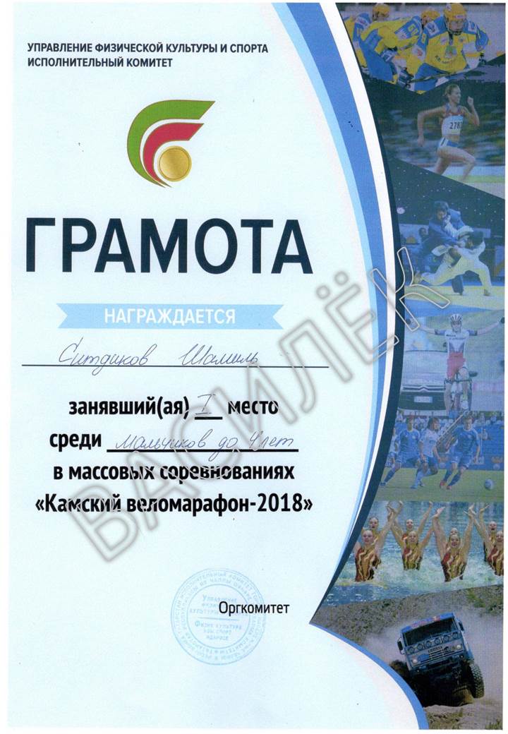Ситдиков Шамиль, грамота 1 место среди мальчиков 4-х лет в массовых соревнованиях "Камский Веломарафон - 2018", 2018