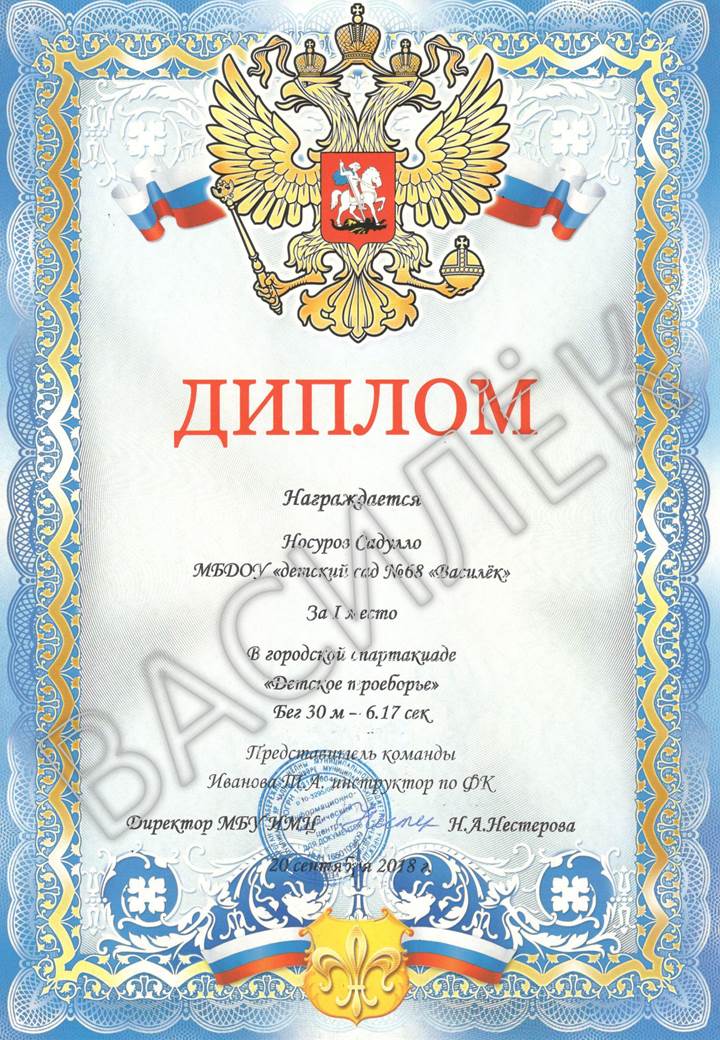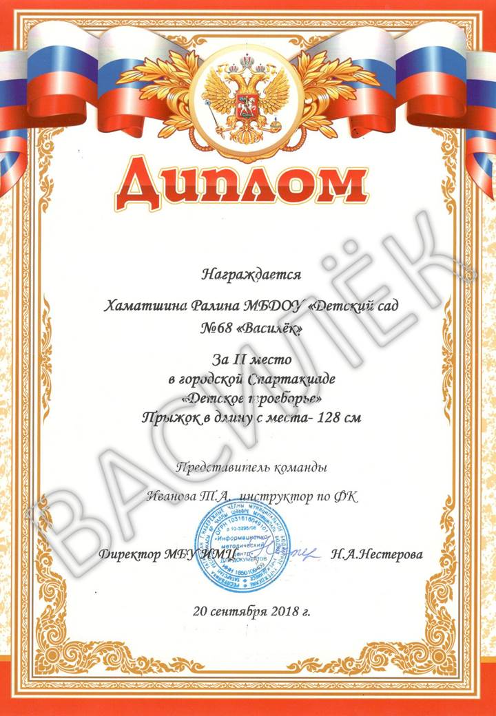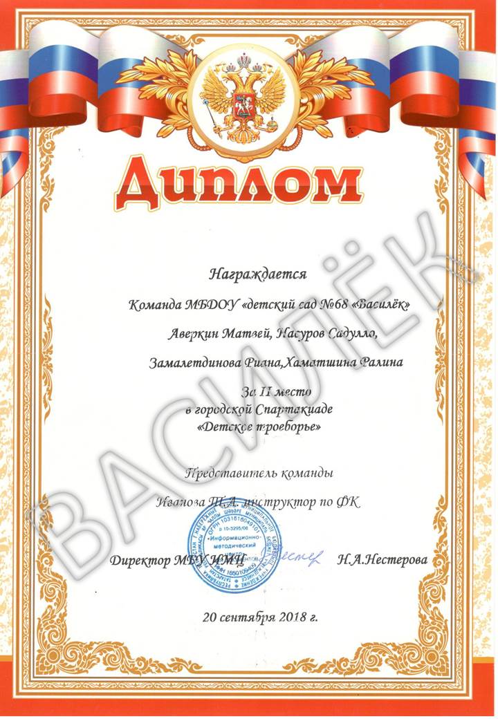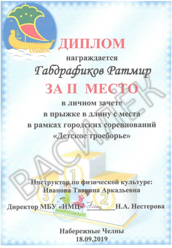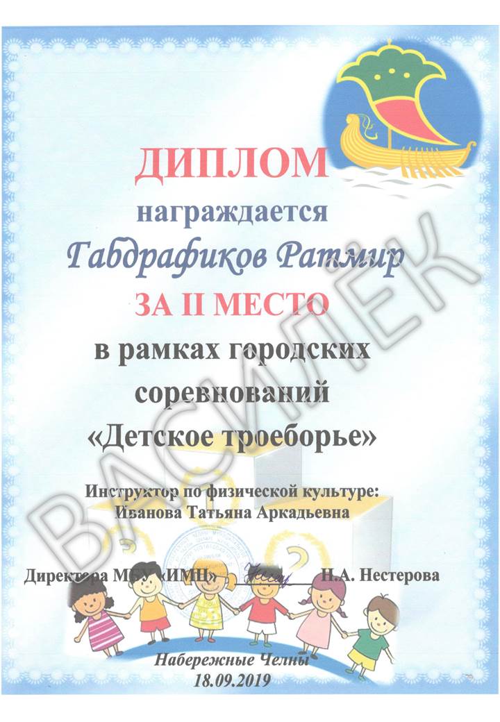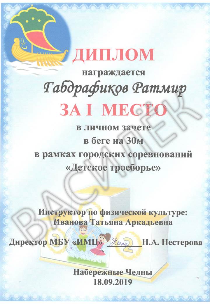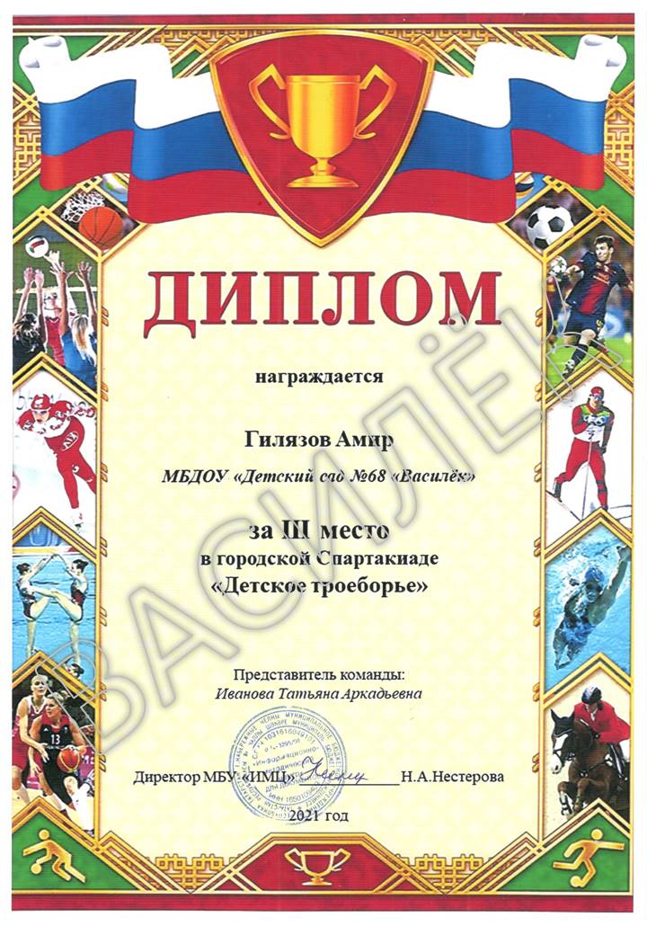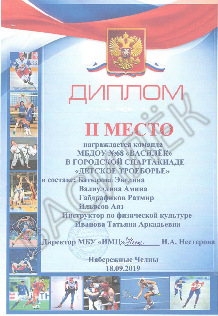 Команда МБДОУ №68 "Василёк", диплом II место в городской Спартакиаде "Детское троеборье", 2019; Габдрафиков Ратмир, диплом II место; Габдрафиков Ратмир, диплом I место (бег 30 м.); Габдрафиков Ратмир, диплом II место (прыжок в длину с места); Валиуллина Амина, диплом III место (прыжок в длину с места); Ильясов Аяз, диплом III место (прыжок в длину с места) в городской Спартакиаде "Детское троеборье", 2019