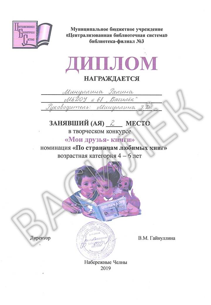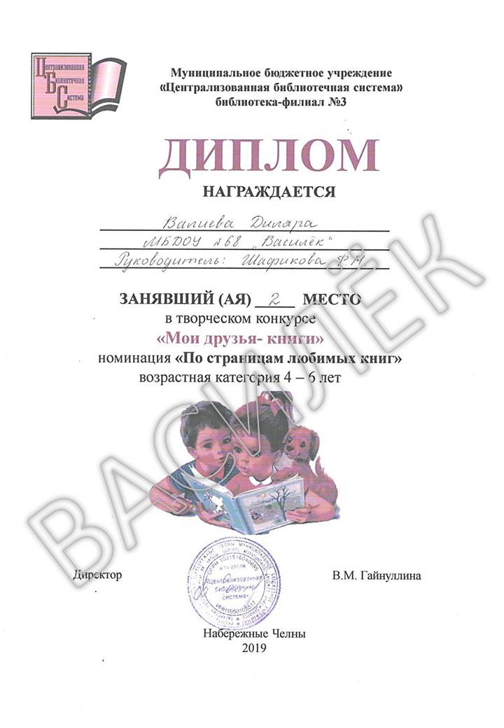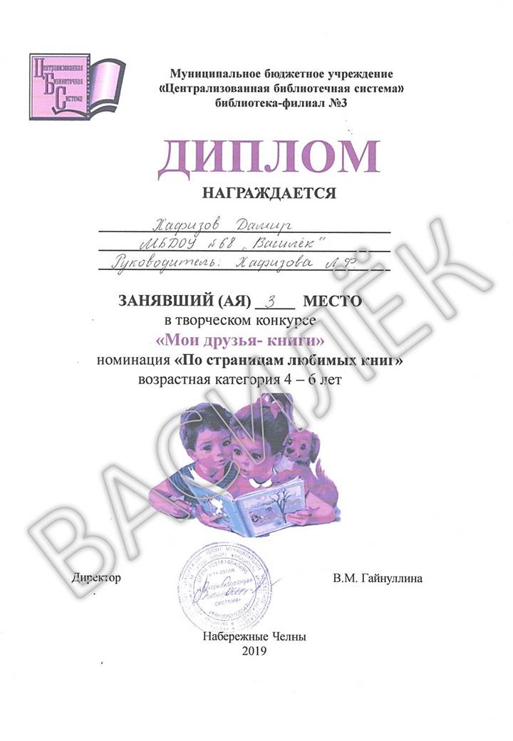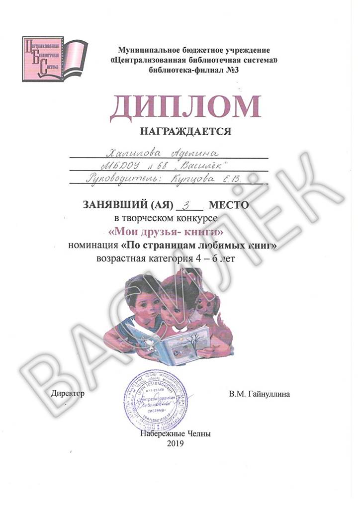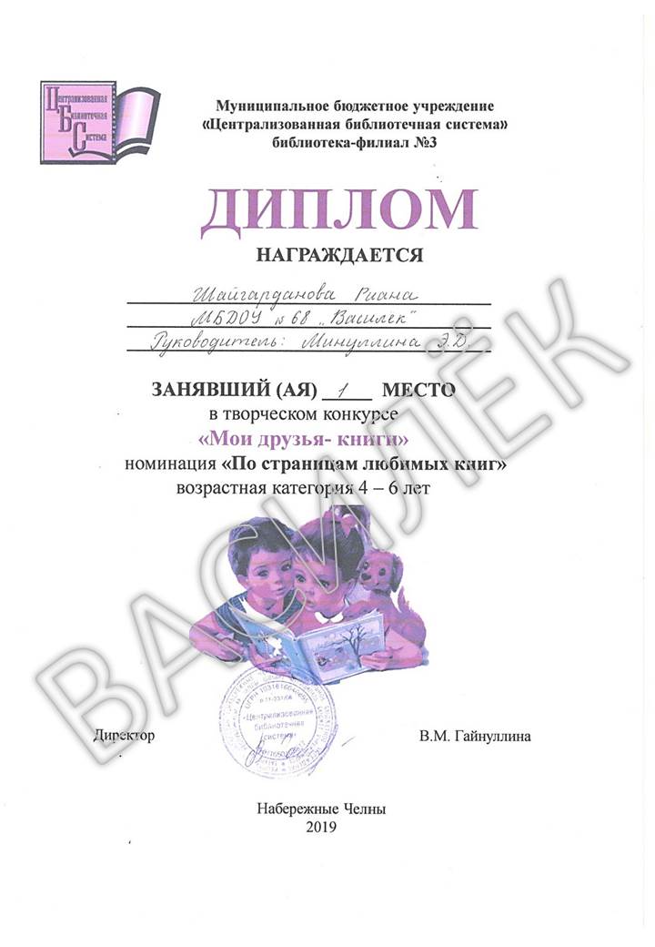 Шайгарданова Риана, диплом1 место, Валиева Диляра, диплом 2 место, Минуллина Ралина, диплом 2 место, Валиева Самина, диплом 2 место, Хафизов Дамир, диплом 3 место, Халилова Аделина, диплом 3 место в творческом конкурсе "Мои друзья - книги", в номинации "По страницам любимых книг", 2019