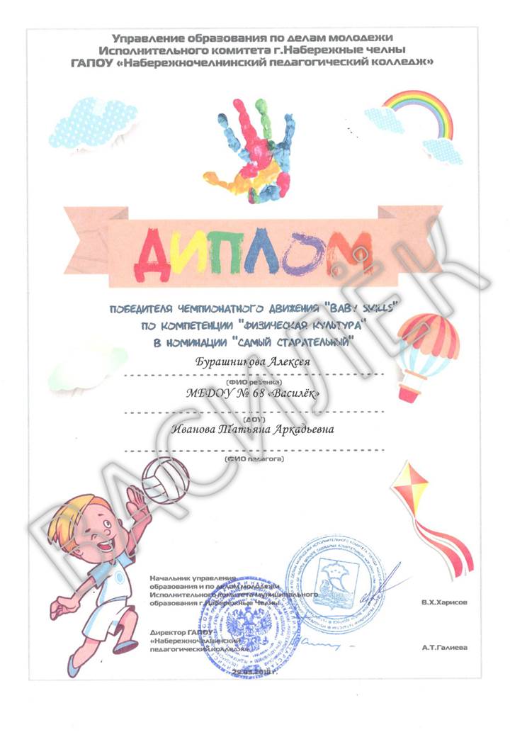 Буашников Алексей, диплом Победителя чемпионатного движения «BabySkills» по компетенции "физическая культура" в номинации "Самый старательный", 2019