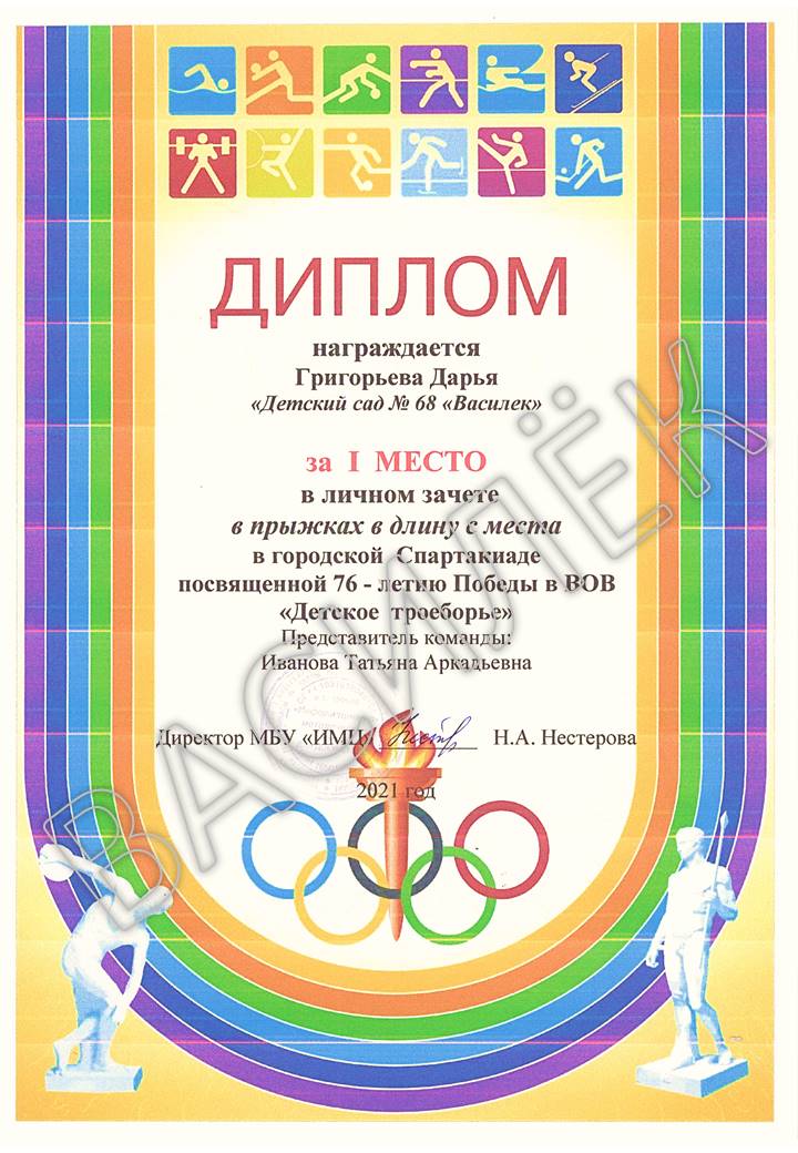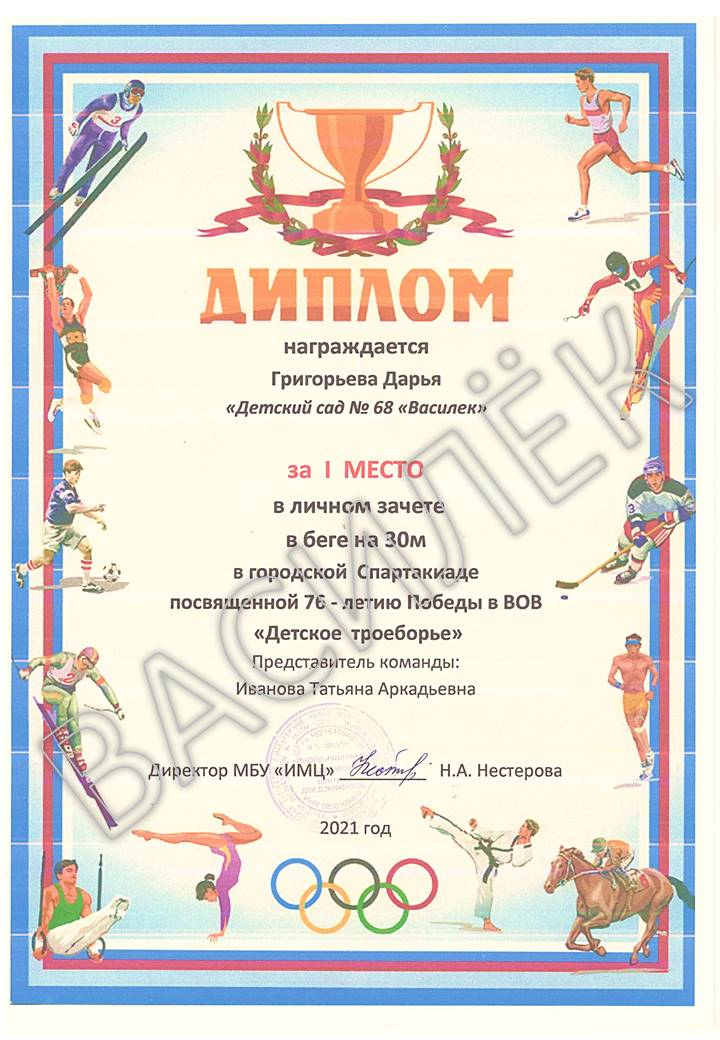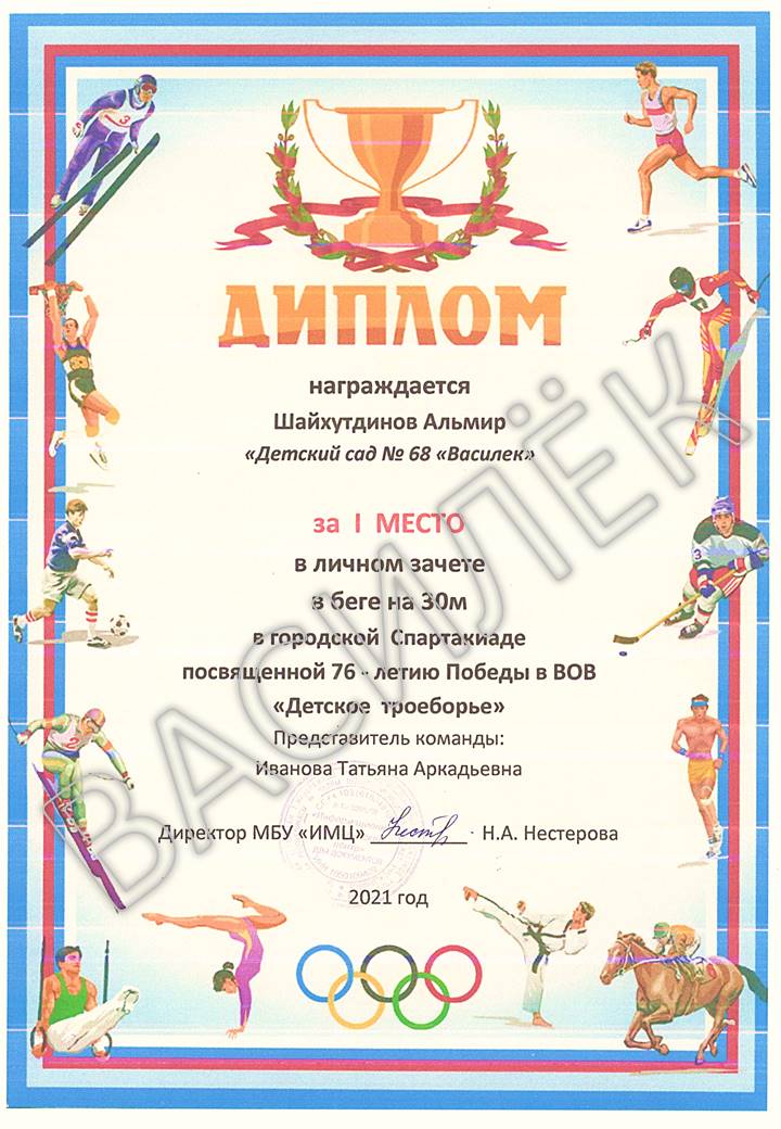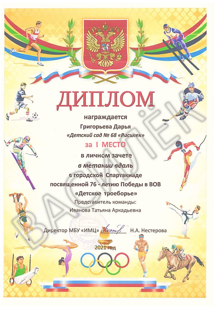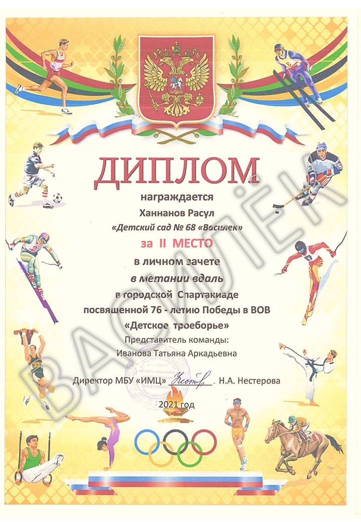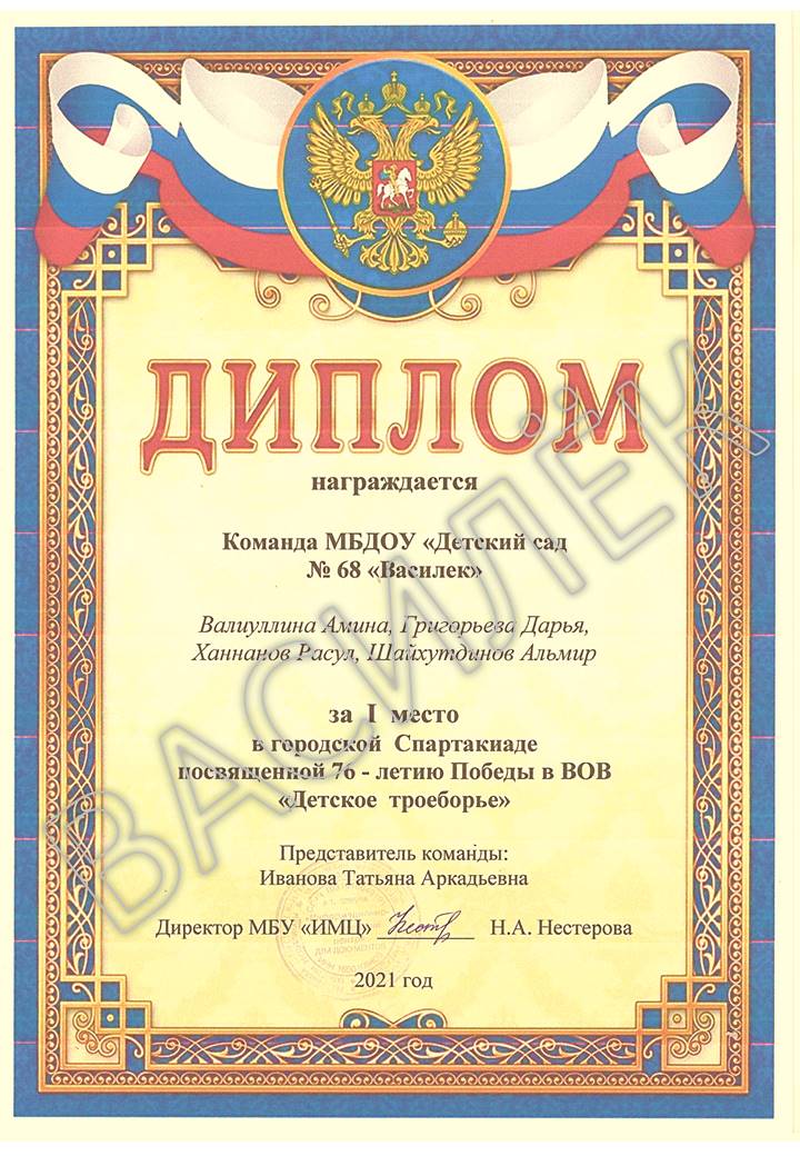Команда МБДОУ №68 "Василёк",диплом I место в городских соревнованиях "Детское троеборье", 2021; Григорьева Даша, диплом I место (бег 30 м., прыжок в длину с места, метание); Валиуллина Амина, диплом II место (бег 30 м.); Ханнанов Расул, диплом II место (метание), Шайхутдинов Альмир, диплом I место (бег 30 м.) в городской Спартакиаде "Детское троеборье", 2021