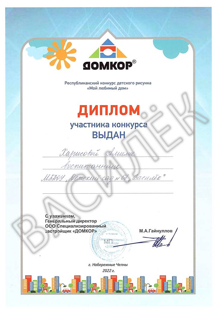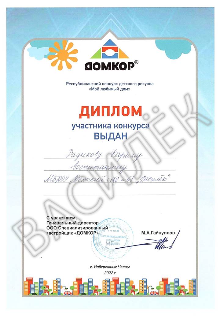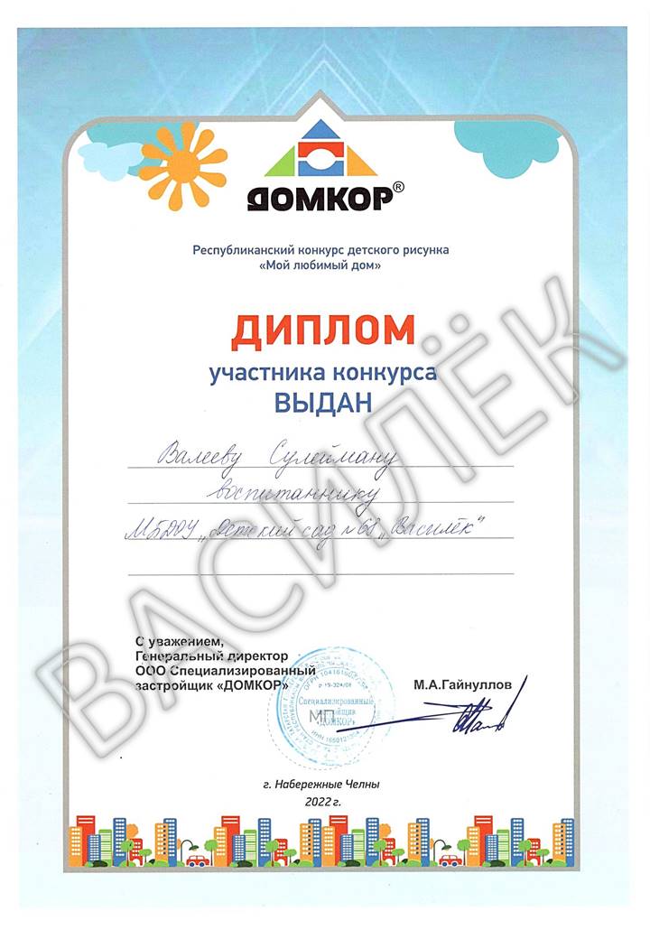 Валеев Сулейман, Харисова Амилия, Радиков Карим, диплом участника городского конкурса детского рисунка "Мой любимый дом",2022