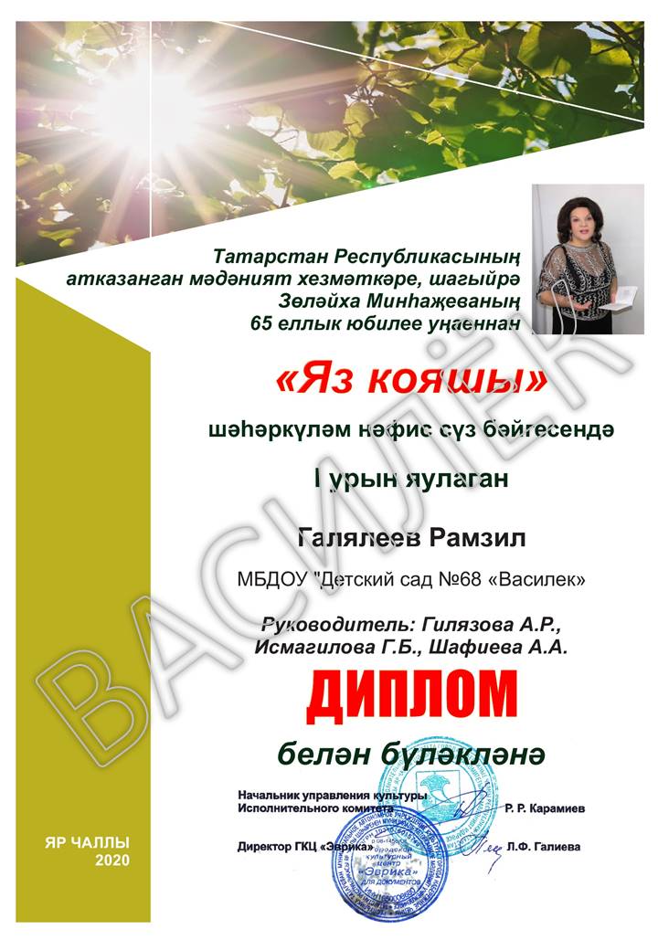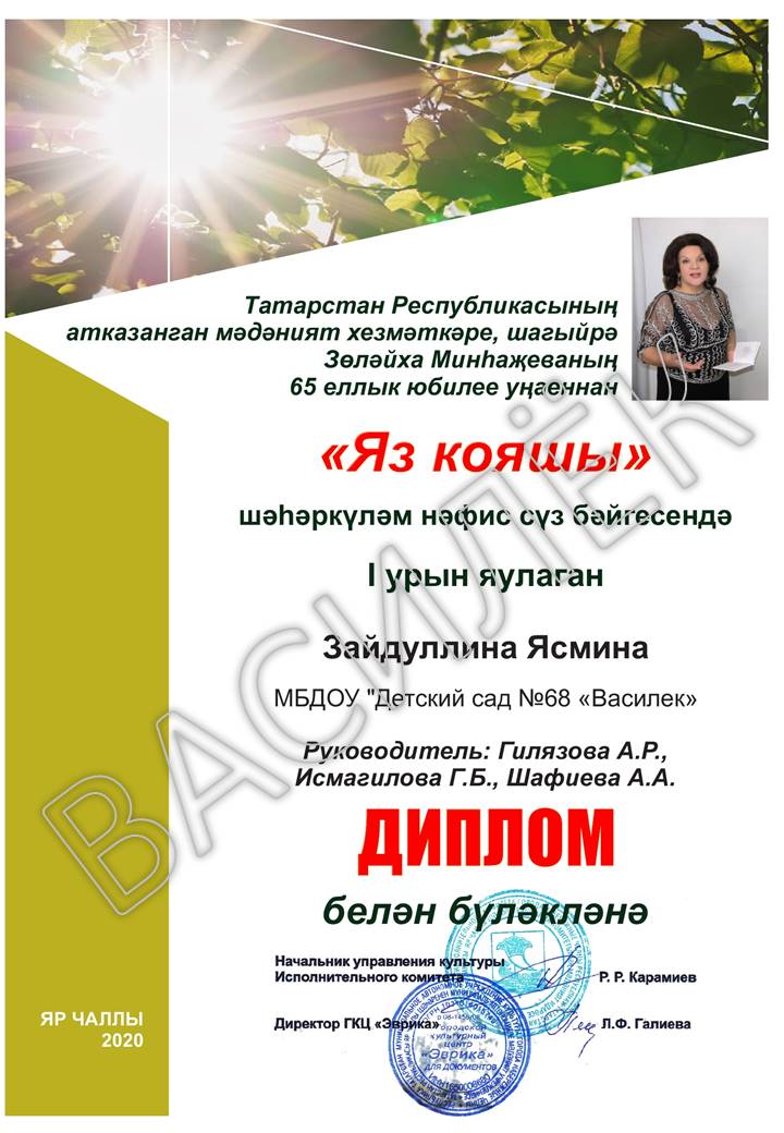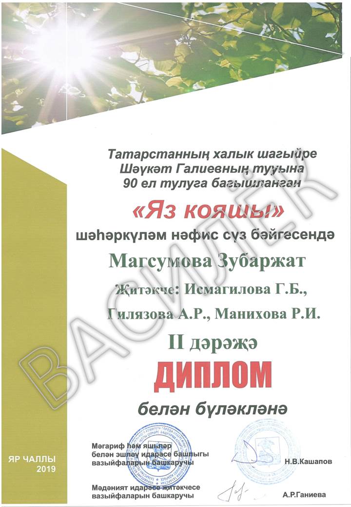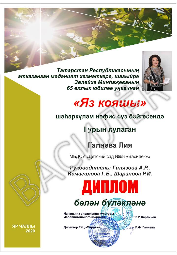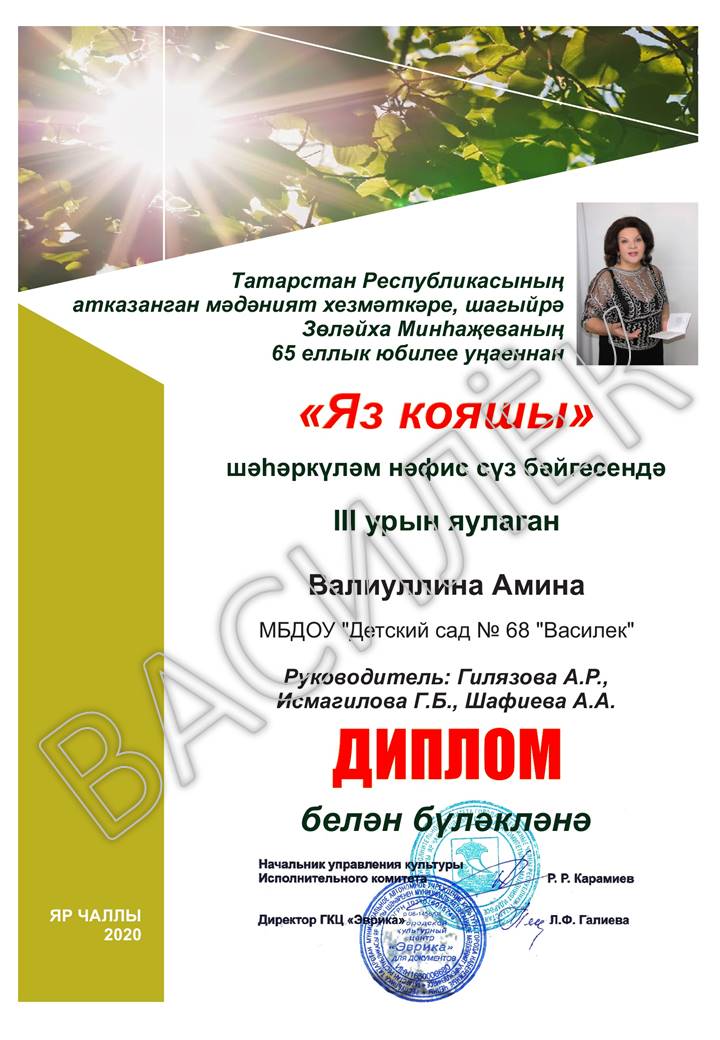 Галялиев Рамзил - диплом 1 степени, Галиева Лия - диплом 1 степени, Таганова Айсылу - диплом 1 степени, Зайдуллина Ясмина - диплом 1 степени, Валиуллина Амина– диплом 3 степени в городском конкурсе чтецов «Яз кояшы», посвященный Дню рождения З. Мингазовой, 2020