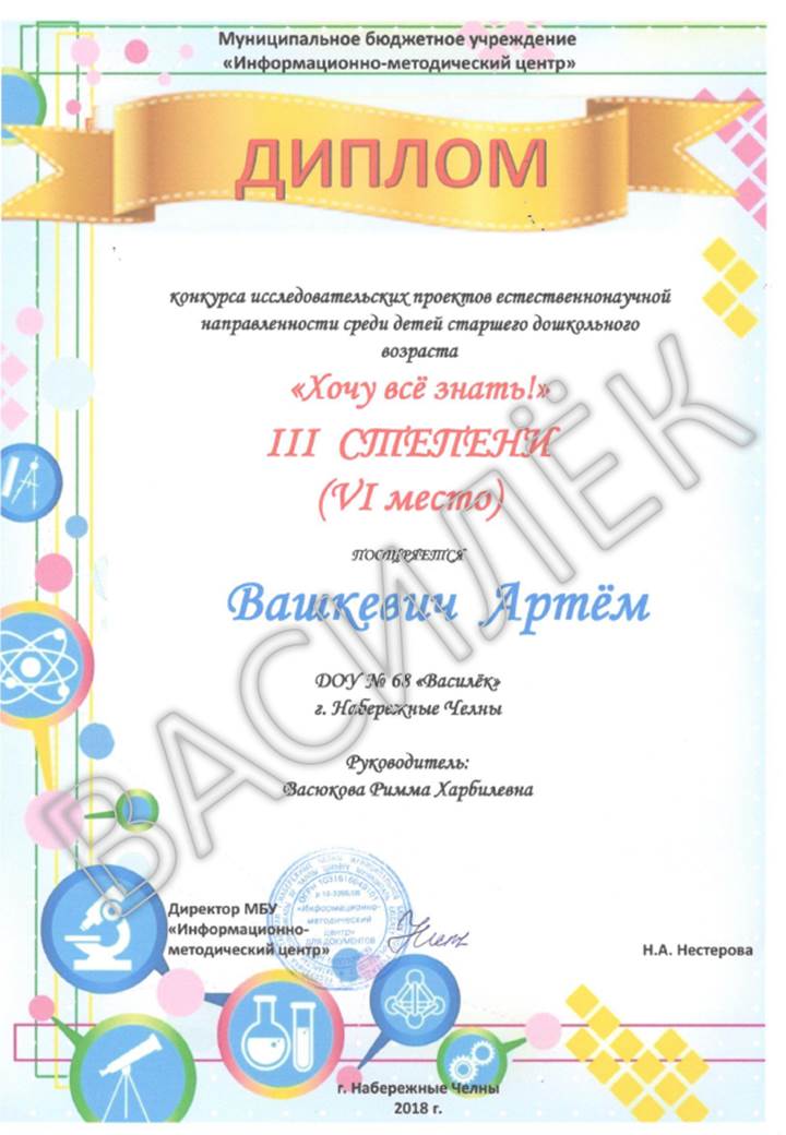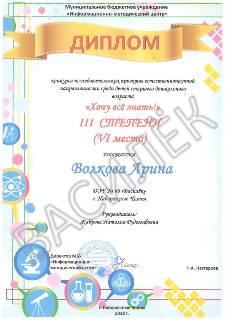 Волкова Арина, Вашкевич Артем, диплом III степени в городском конкурсе творческих проектов и исследовательских работ "Хочу все знать!",2018