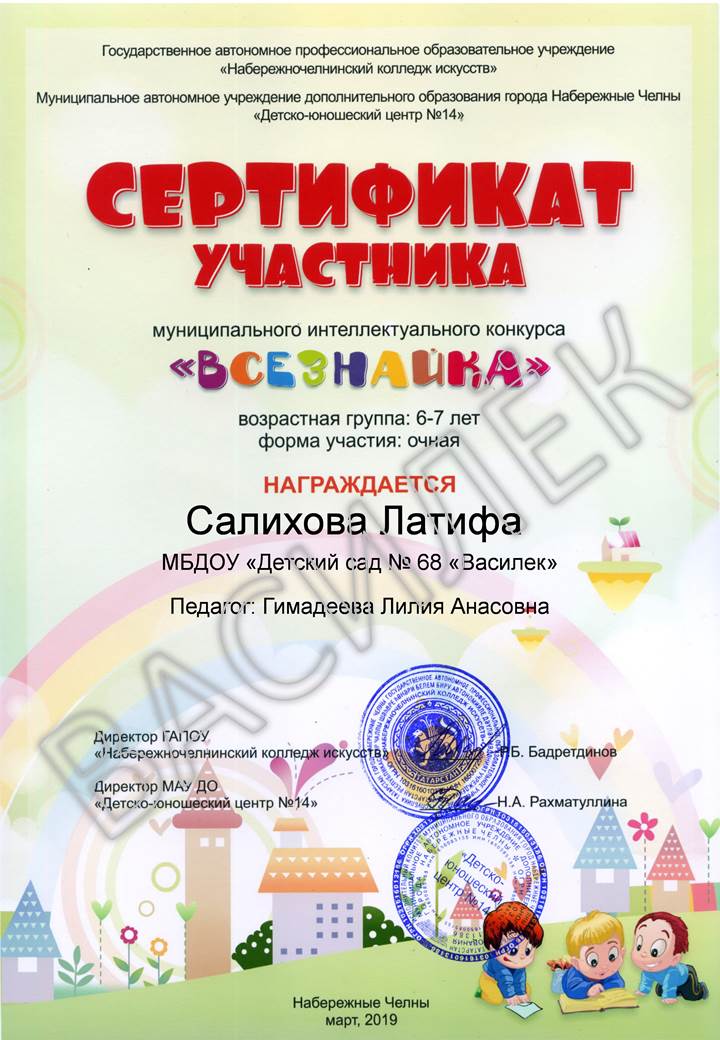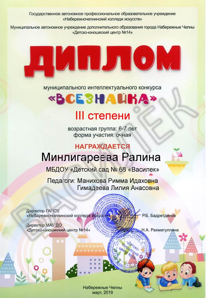 Минлигареева Ралина, диплом III степени, Салихова Латифа, сертификат участника муниципального интеллектуального конкурса "Всезнайка", 2019