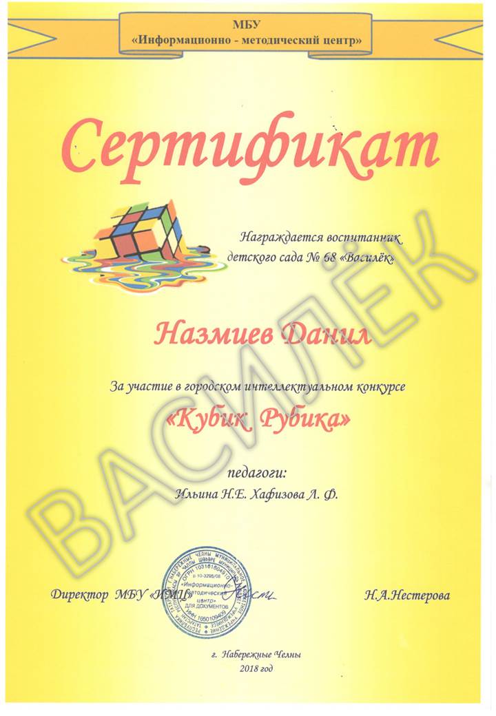 Мингалимов Тагир, диплом I степени за победу, Назмиев Данил, сертификат за участие в городском интеллектуальном конкурсе "Кубик Рубика", 2018