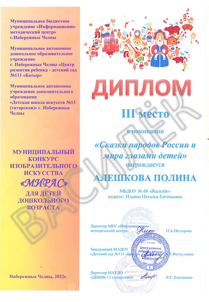 Алешкова Полина, диплом III место в муниципальном конкурсе изобразительного искусства "Мирас", 2022