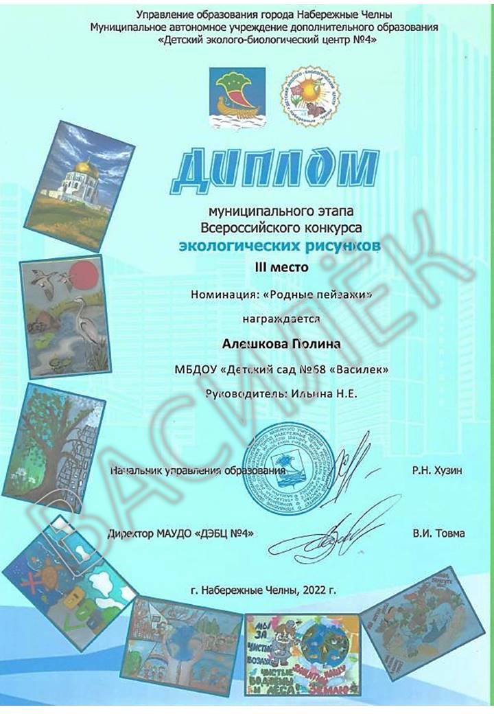 Алешкова Полина, диплом III место в муниципальном этапе Всероссийского конкурса экологических рисунков, 2022