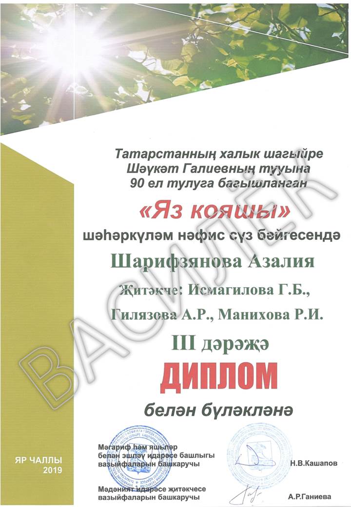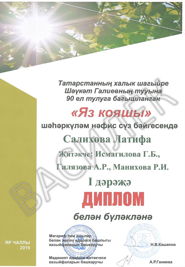 Салихова Латифа, диплом I степени, Магсумова Зубаржат, диплом II степени, Шарифзянова Азалия, диплом III степени городского конкурса чтецов, посвященного Дню рождения Ш. Галиеву, 2019