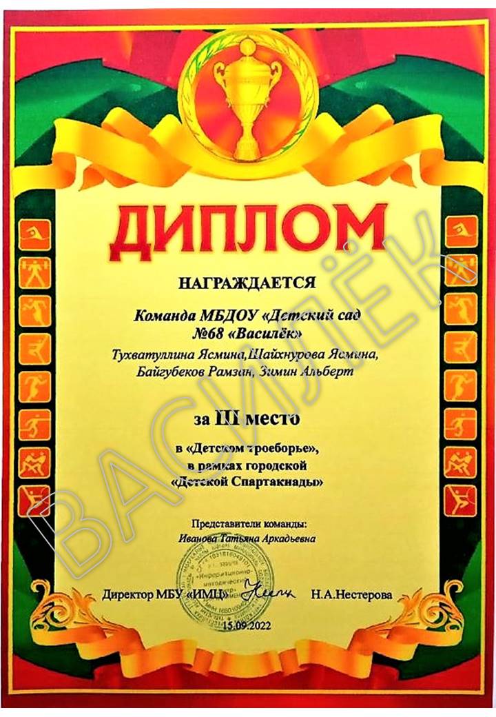 Команда МБДОУ №68 "Василёк",диплом II место; Гилязов Амир, диплом III место, Денмухаметов Ризван, диплом III место, в городских соревнованиях "Детское троеборье", сентябрь, 2021
