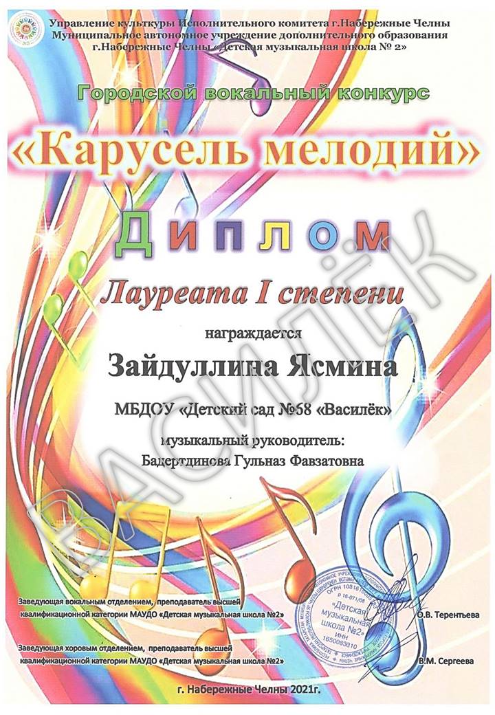 Зайдуллина Ясмина - диплом Лауреата I степени в городском вокальном конкурсе "Карусель мелодий", 2021