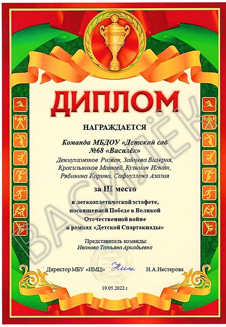 Команда МБДОУ №68 "Василёк", диплом III место в легкоатлетисеской эстафете в рамках городской Спартакиады, 2022