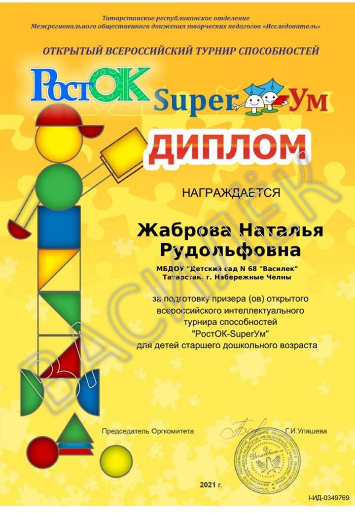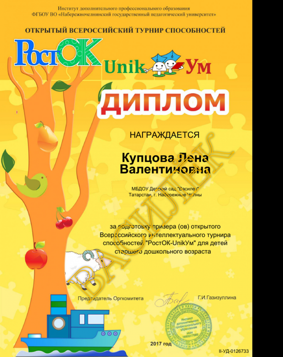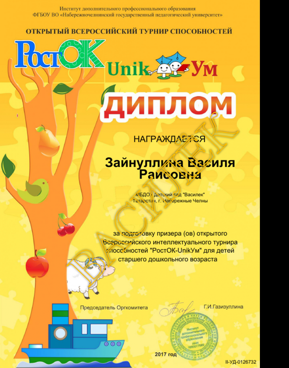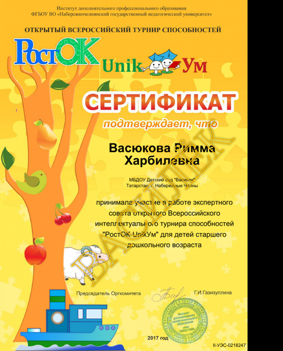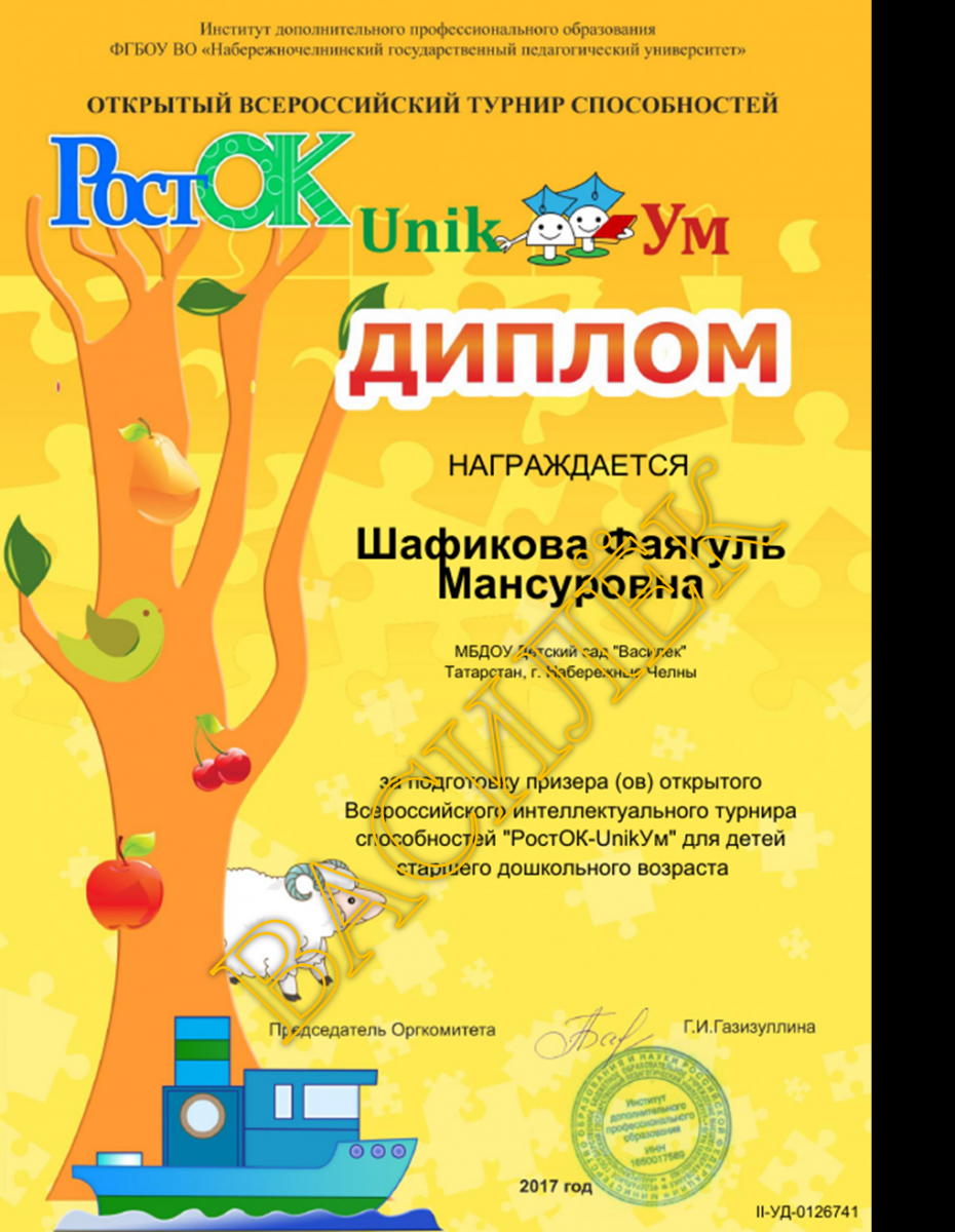 Васюкова Римма Харбилевна, сертификат, Купцова Лена Валентиновна, диплом за подготовку призеров, Шафикова Фаягуль Мансуровна, диплом за подготовку призеров, Шарафутдинова Алмазия Шайхенуровна, диплом за подготовку призеров, Зайнуллина Василя Раисовна, диплом за подготовку призеров,Открытый всероссийский интелектуальный турнир способностей "РостОК-SuperУм" для детей старшего дошкольного возраста, 2017