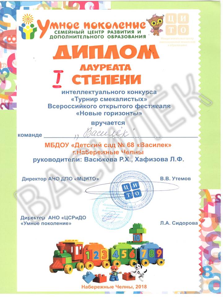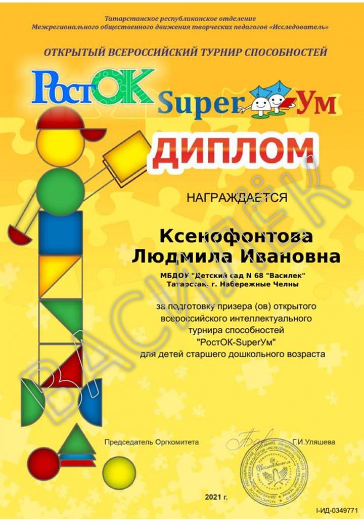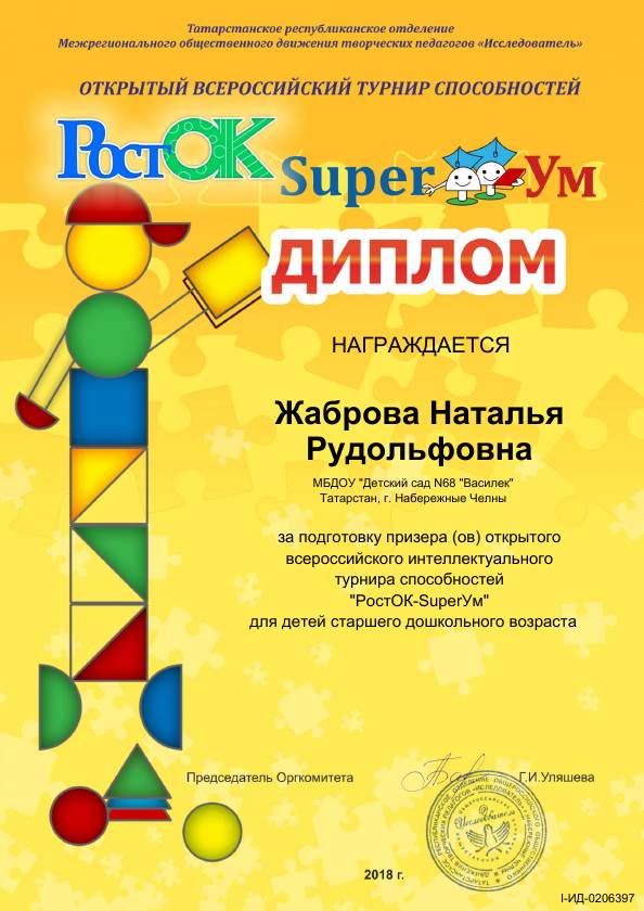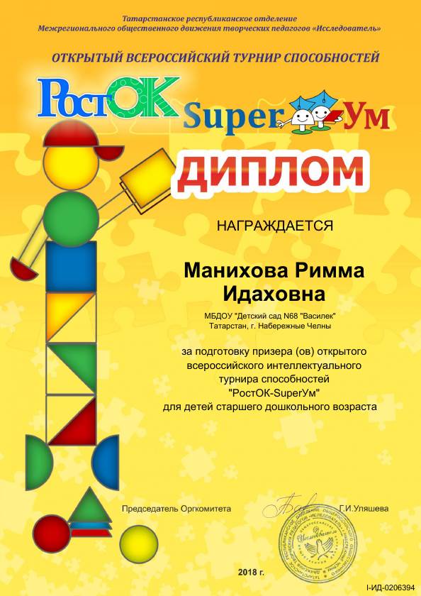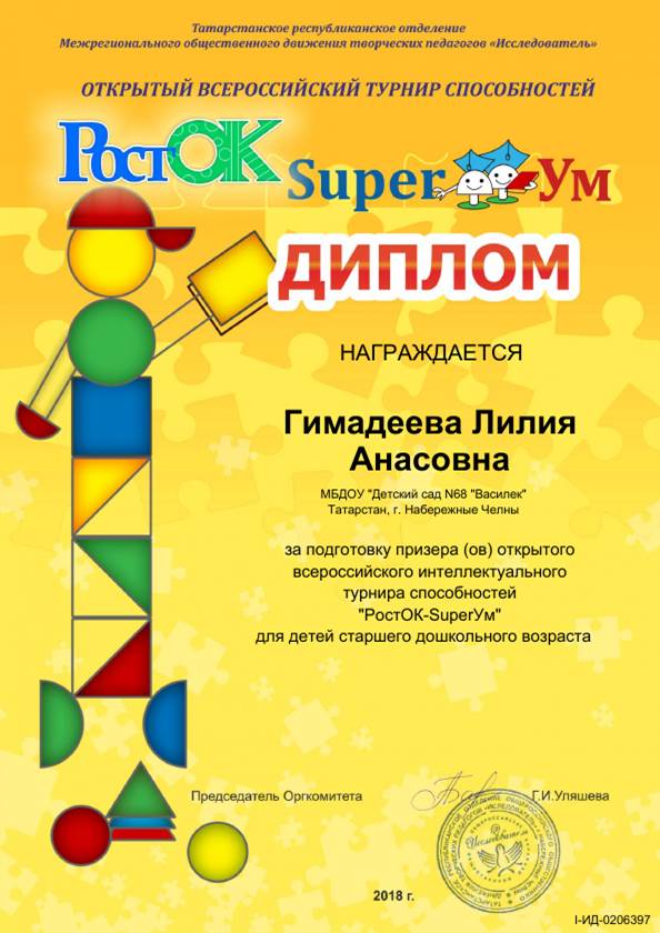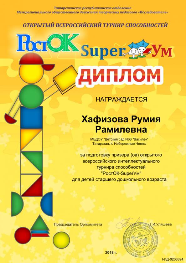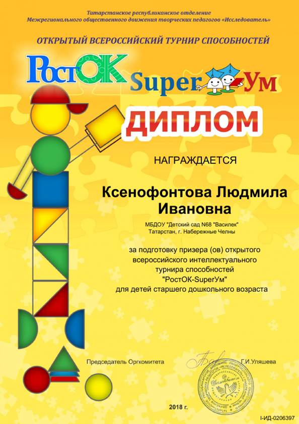 Гимадеева Лилия Анасовна, диплом за подготовку призеров, Жаброва Наталья Рудольфовна, диплом за подготовку призеров, Ксенофонтова Людмила Ивановна, диплом за подготовку призеров, Манихова Римма Идаховна, диплом за подготовку призеров, Хафизова Румия Рамилевна, диплом за подготовку призеров, Открытый всероссийский интелектуальный турнир способностей "РостОК-SuperУм" для детей старшего дошкольного возраста, 2018