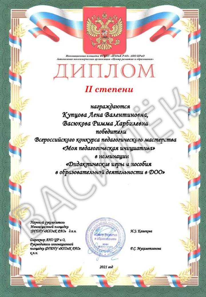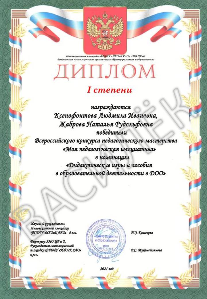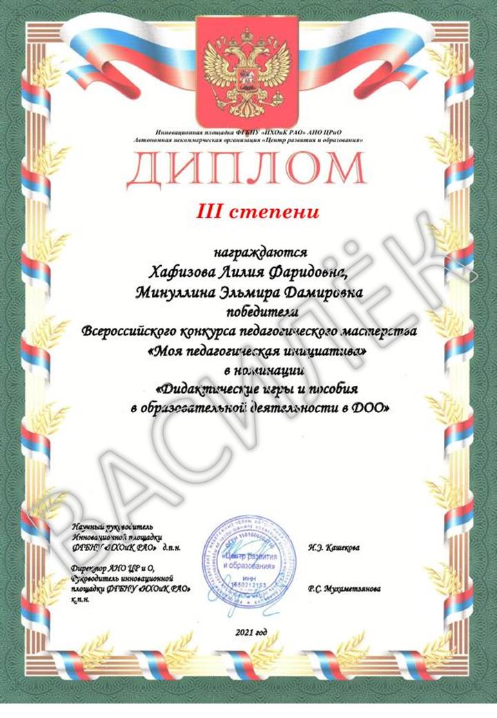 Жаброва Наталья Рудольфовна, Ксенофонтова Людмила Ивановна, диплом I степени; Купцова Лена Валентиновна, Васюкова Римма Харбилевна, диплом II степени; Хафизова Лилия Фаридовна, Минуллина Эльмира Дамировна, диплом III степени Всероссийского конкурса педагогического мастерства "Моя педагогическая инициатива" в номинации "Дидактические игы и пособия", 2021