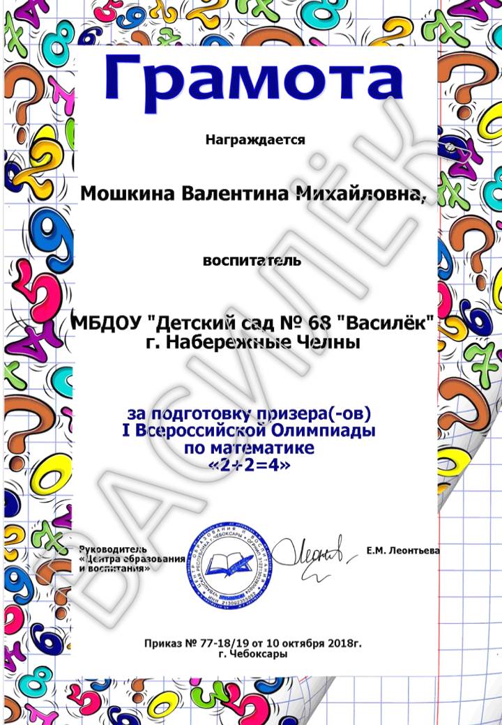 Мошкина Валентина Михайловна, грамота за подготовку призера Всероссийской Олимпиады по математике "2+2=4", 2018