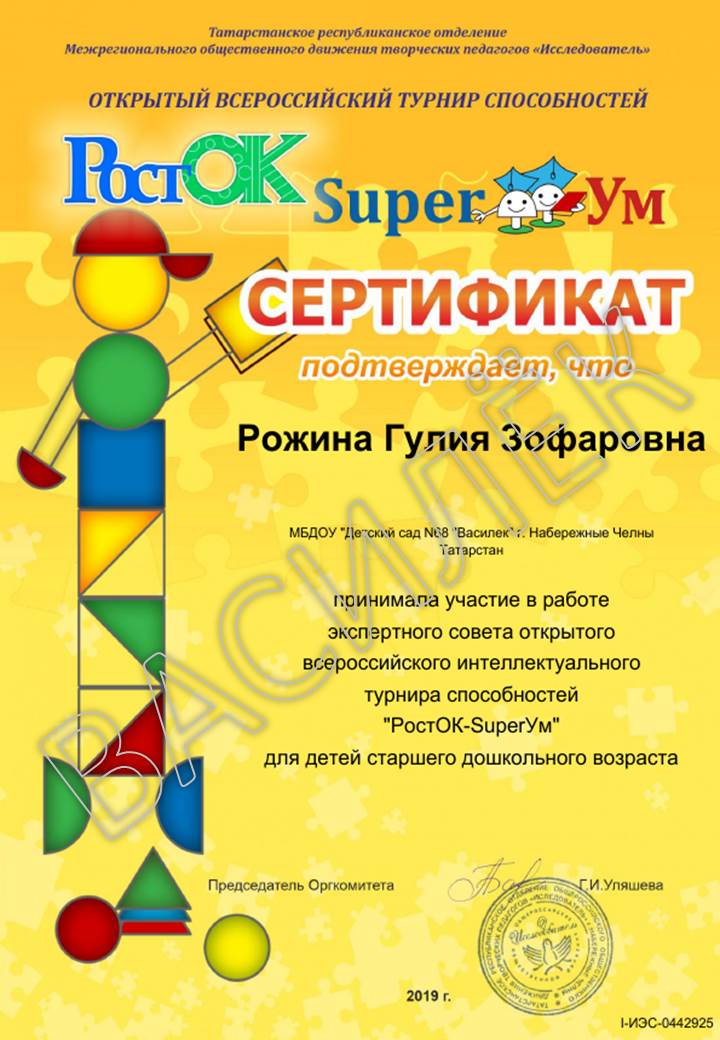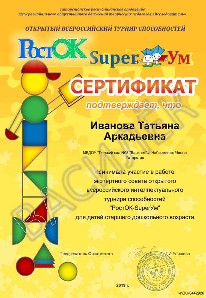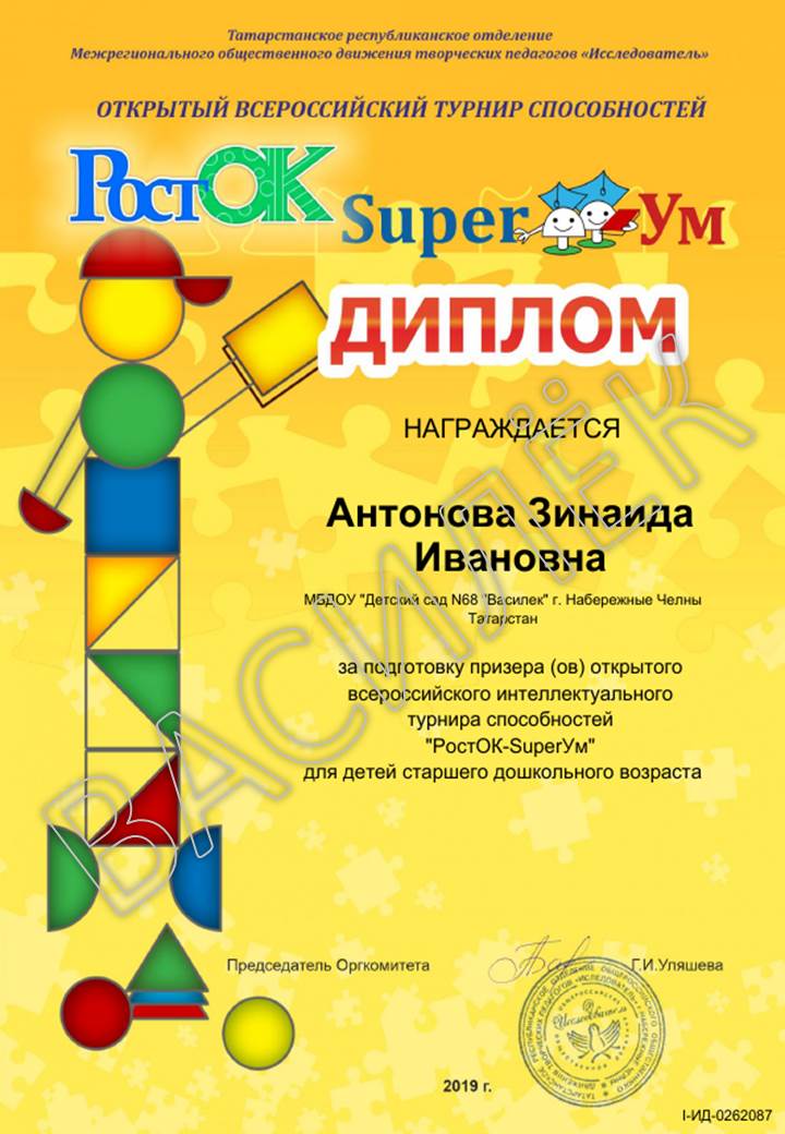 Варламова Эльза Аркадьевна, Антонова Зинаида Ивановна, диплом за подготовку призеров, Рожина Гулия Зофаровна, Иванова Татьяна Аркадьевна, сертификат, Открытый всероссийский интелектуальный турнир способностей "РостОК-SuperУм" для детей старшего дошкольного возраста, 2019
