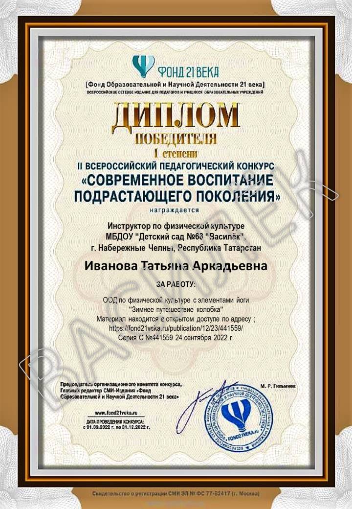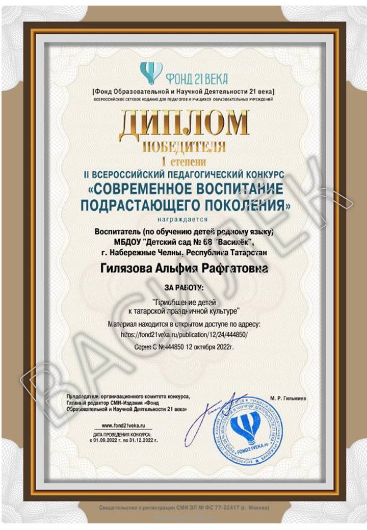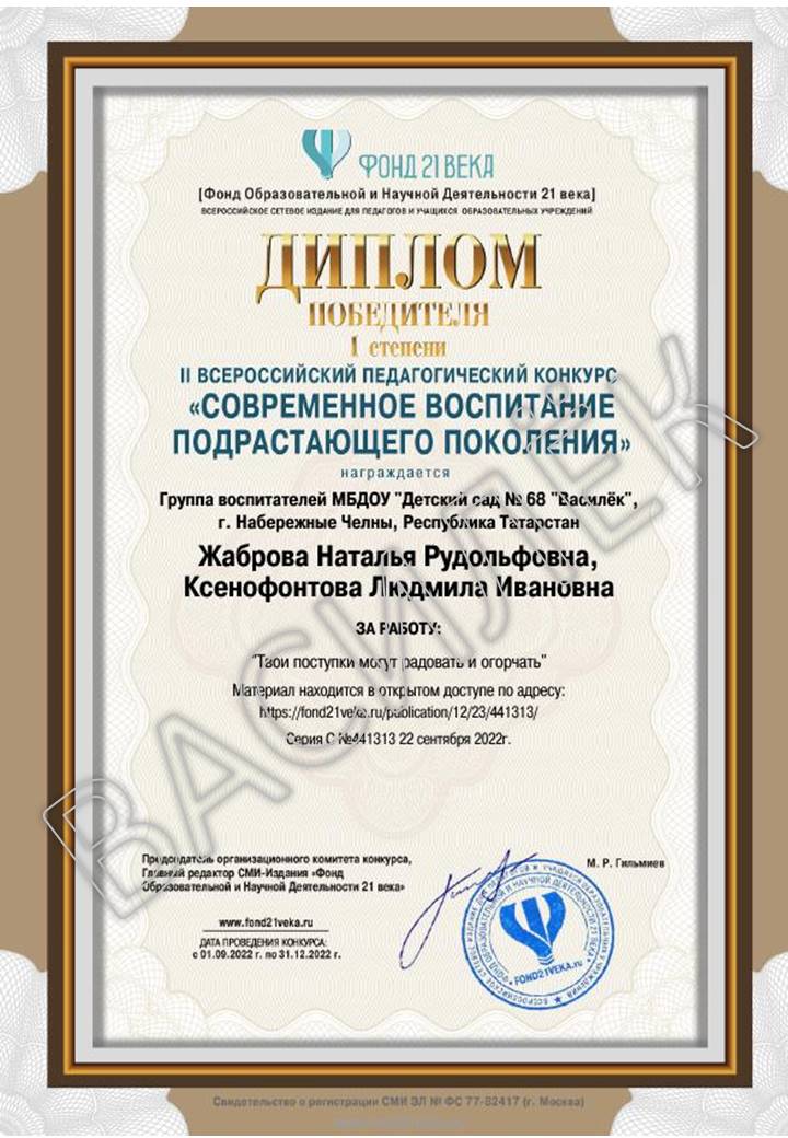 Жаброва Наталья Рудольфовна, Ксенофонтова Людмила Ивановна,,диплом I степени, Иванова Татьяна Аркадьевна, диплом I степени, Гилязова Альфия Равгатовна, диплом I степени, Всероссийского педагогического конкурса «Современное воспитание подрастающего поколения», 2022