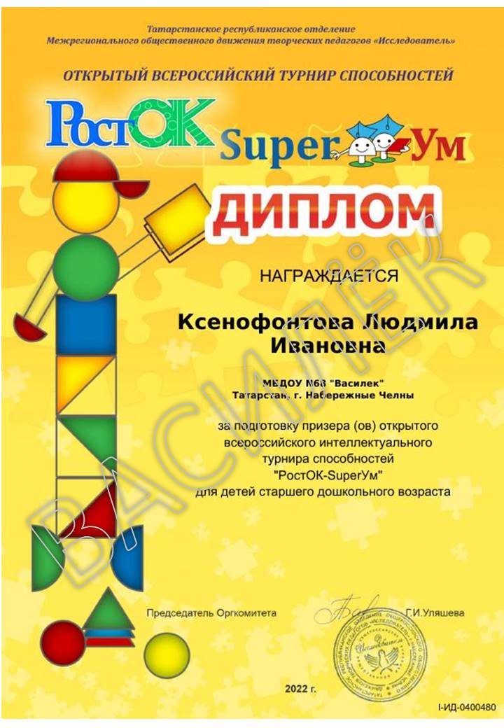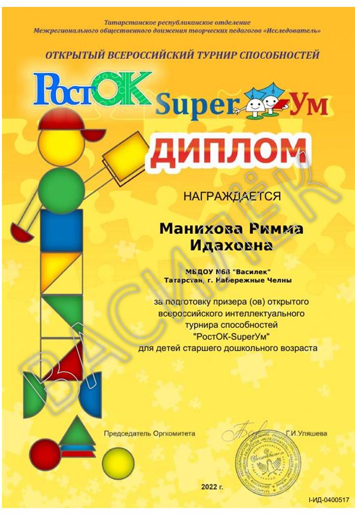 Купцова Лена Валентиновна, Шарапова Эльвира Шагитовна, Жаброва Наталья Рудольфовна, Манихова Римма Идаховна, Ксенофонтова Людмила Ивановна, Шафиева Альфия Амирзяновна, Гайнутдинова Лейсан Рафиковна, диплом за подготовку призеров; Усманова Альфия Ханнановна, за участие образовательного учреждения; Открытый всероссийский интелектуальный турнир способностей "РостОК-SuperУм" для детей старшего дошкольного возраста, 2022