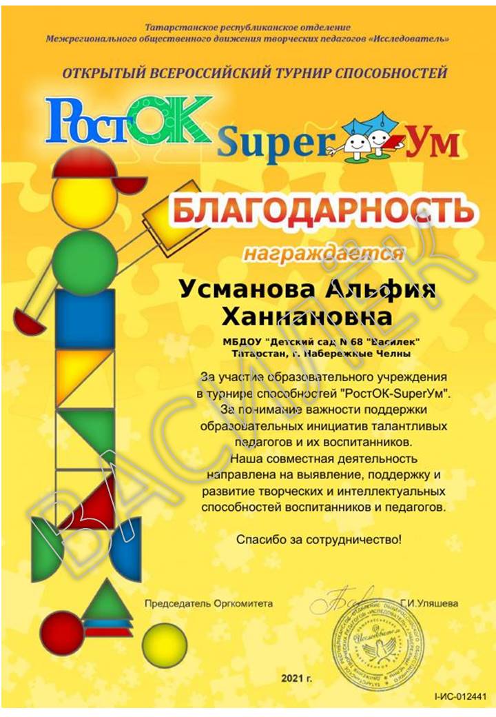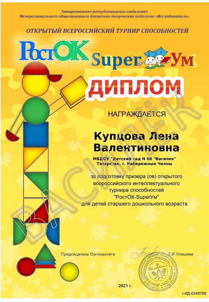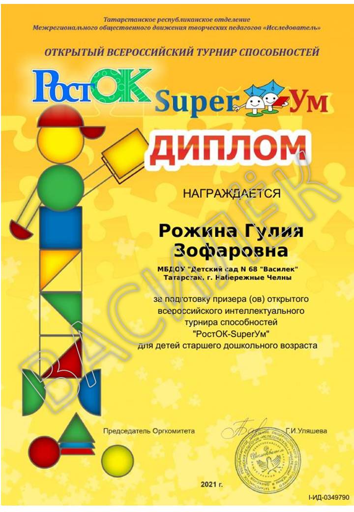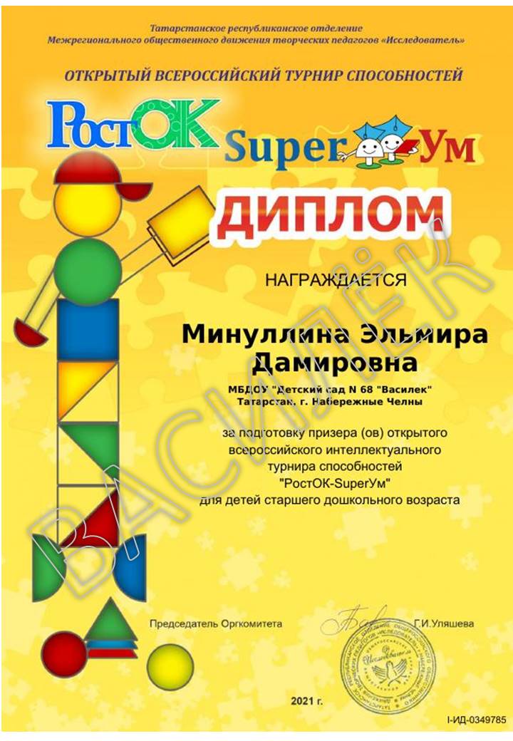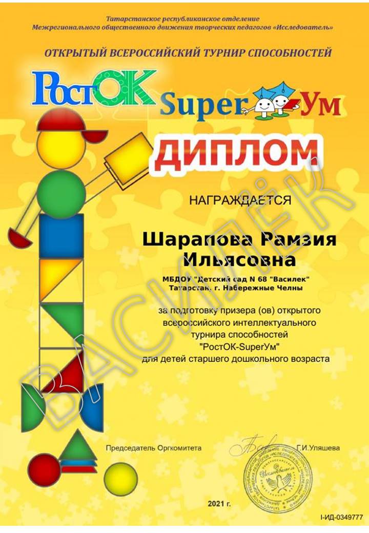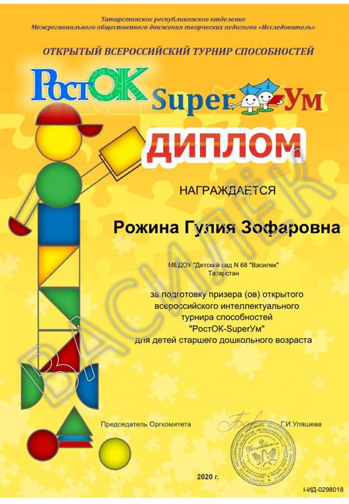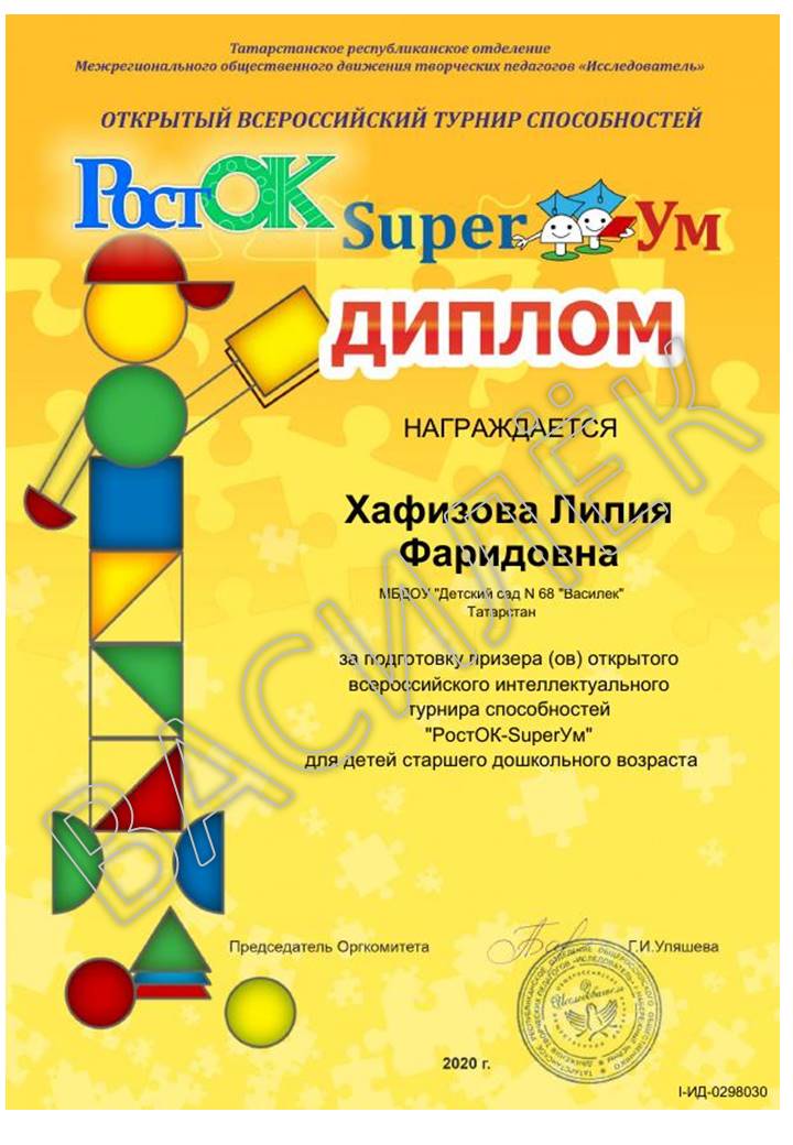 Шарафутдинова Алмазия Шайхенуровна, Шафикова Фаягуль Мансуровна, Купцова Лена Валентиновна, Рожина Гулия Зофаровна, Хафизова Лилия Фаридовна, Васюкова Римма Харбилевна, Ильина Наталья Евгеньевна, Минуллина Эльмира Дамировна, Хлопцева Наталья Валентиновна, диплом за подготовку призеров, Открытый всероссийский интелектуальный турнир способностей "РостОК-SuperУм" для детей старшего дошкольного возраста, 2020